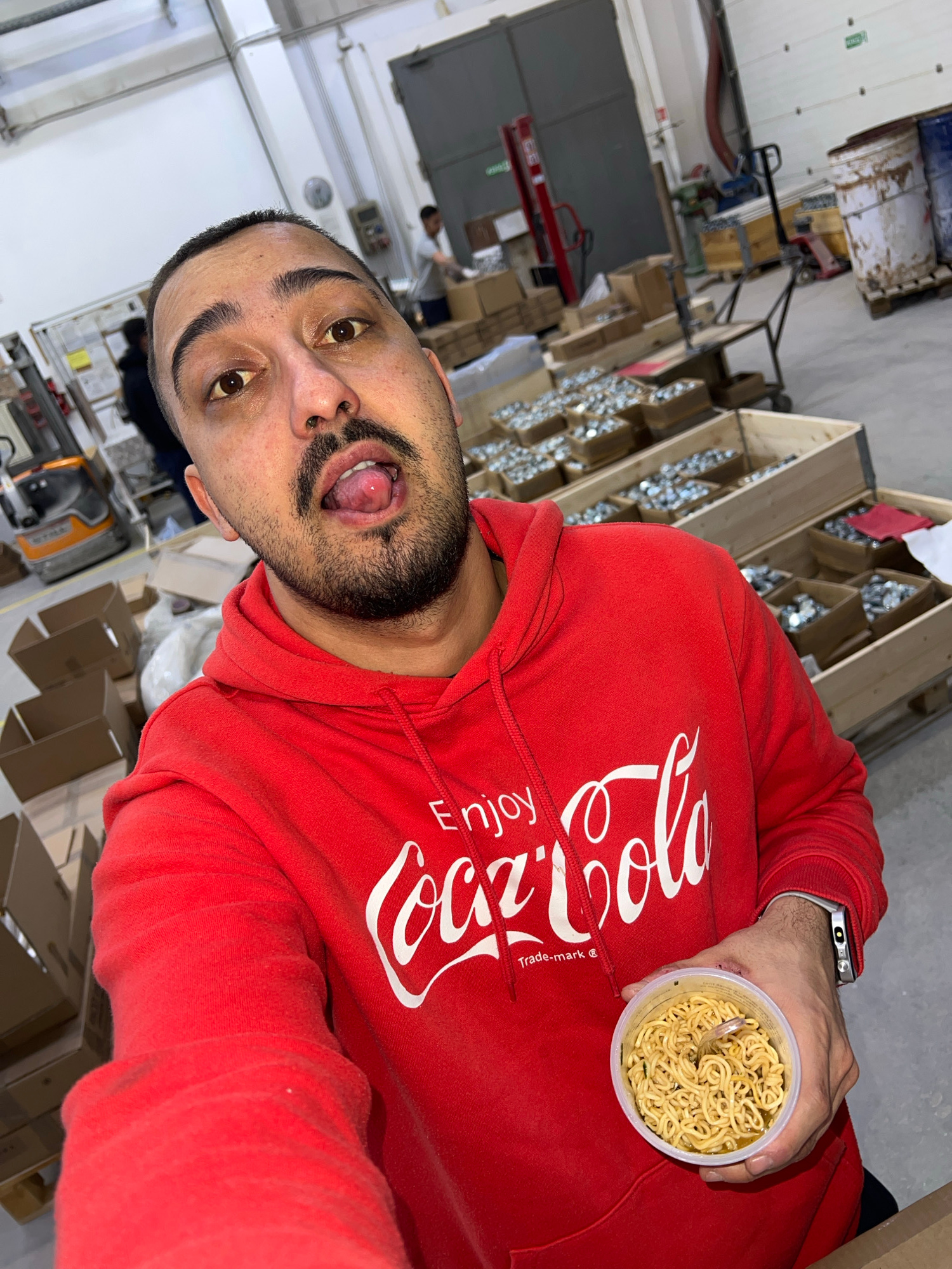 The image shows a man indoors, holding a container of noodles. He is wearing a red Coca-Cola hoodie and a smartwatch. He is sticking his tongue out. Behind him are shelves of fasteners and boxes. The…read more