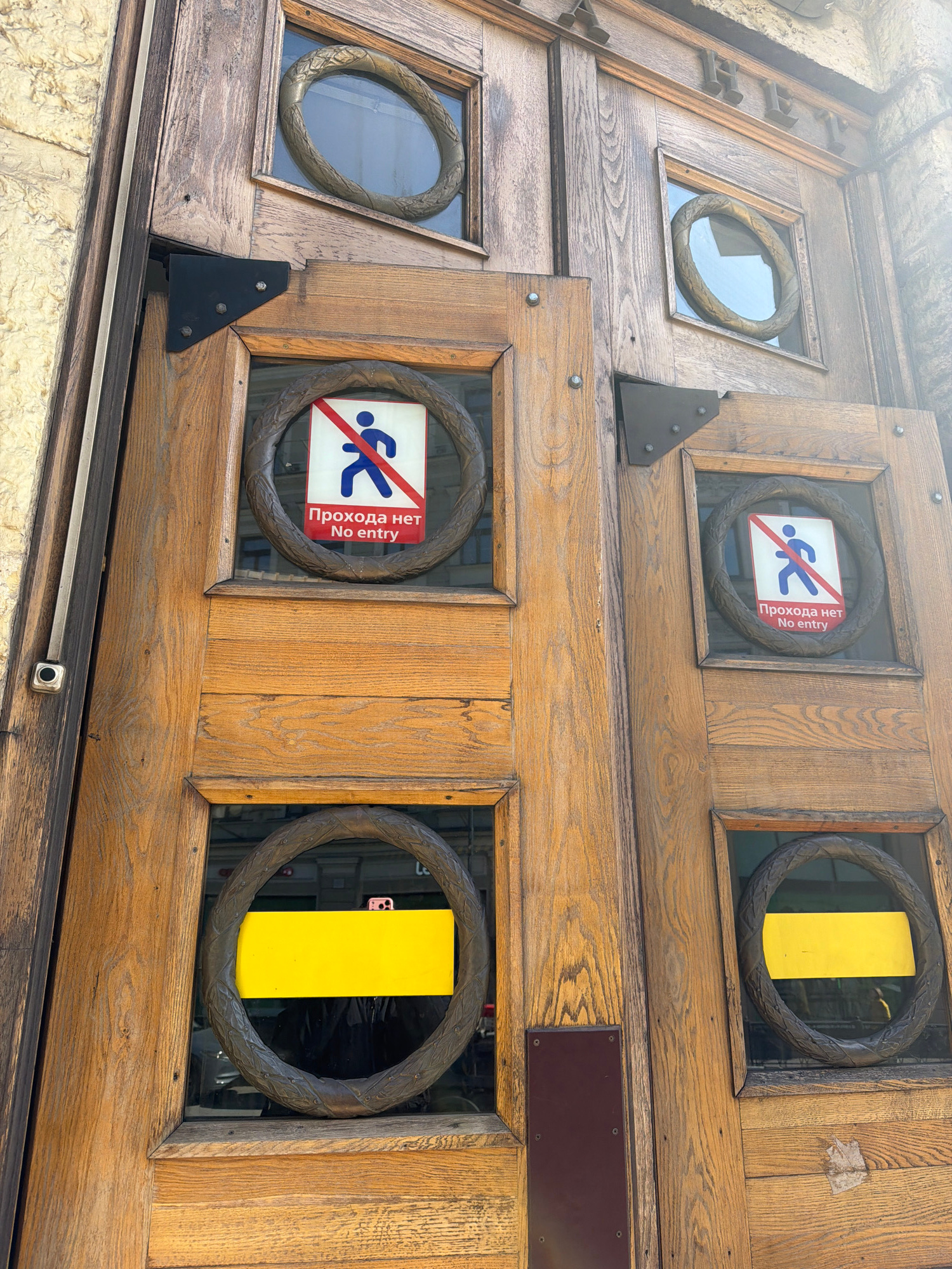 This photograph shows a fragment of a wooden door adorned with circular window frames. Within these frames, various inserts are visible: a clear view through the glass, "No Entry" signs in both Russia…read more