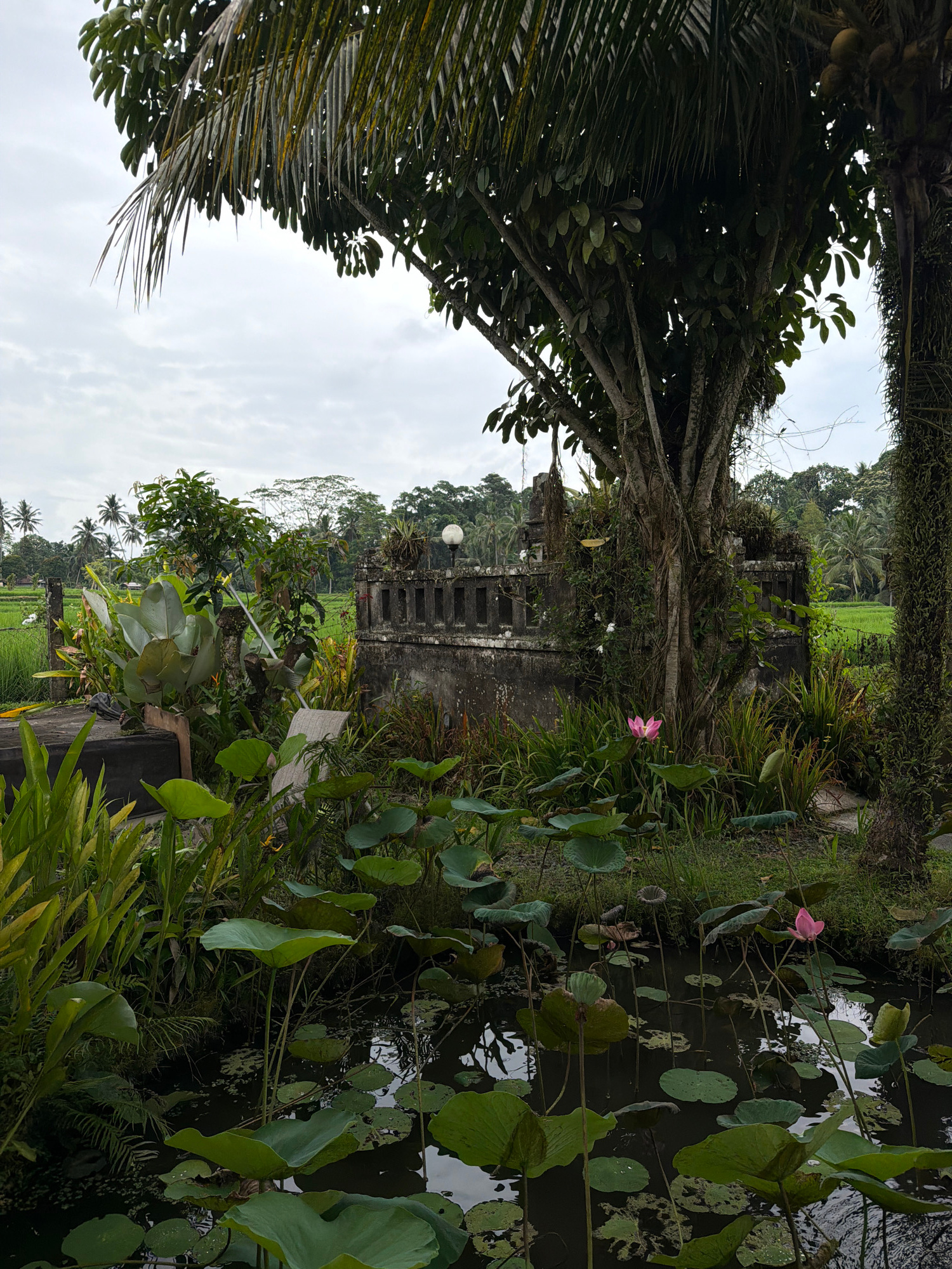 This image captures a serene and verdant landscape in Tegallalang, Indonesia, showcasing a blend of lush nature and traditional architecture under an overcast sky. The foreground on the left is domin…read more
