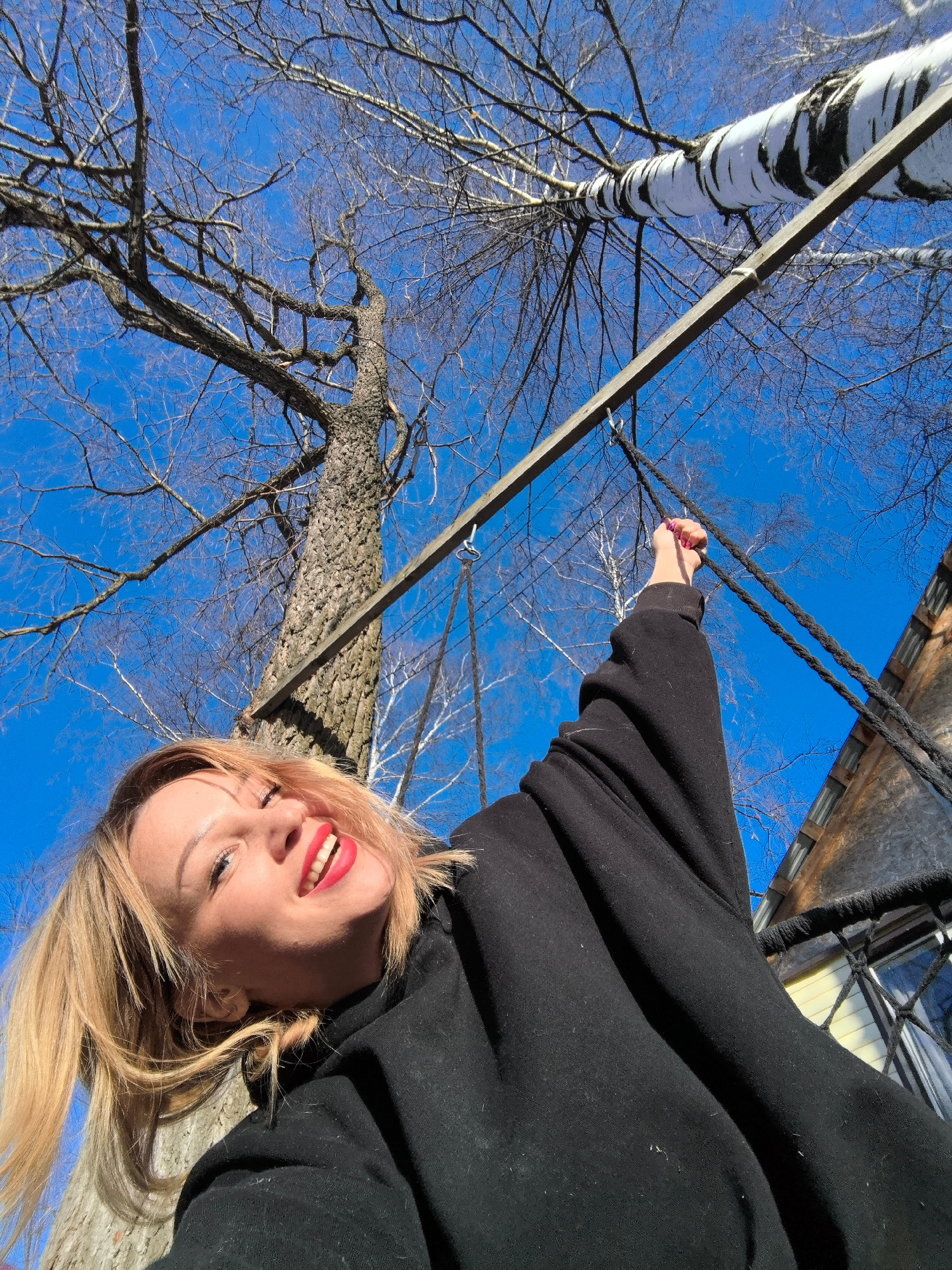 A woman with short blonde hair, bright red lipstick, and a black hoodie is smiling and looking up in Noviy, Russia. She is holding onto a rope that is attached to a metal bar suspended between two tre…read more