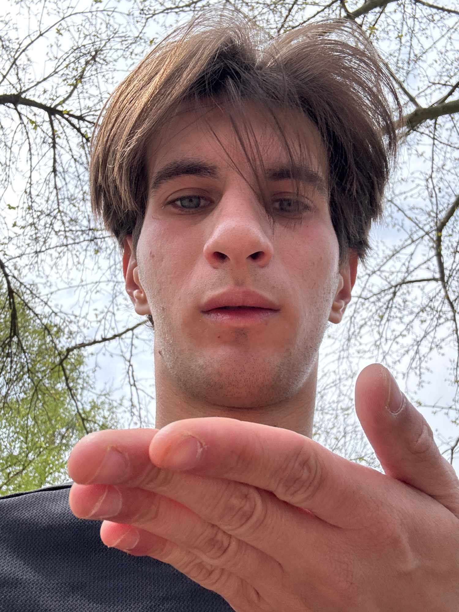 A selfie from a low angle features a young man with light brown hair, fair skin, and hazel eyes. He is looking downward at the camera with a neutral expression. His face is framed by wisps of hair. A…read more