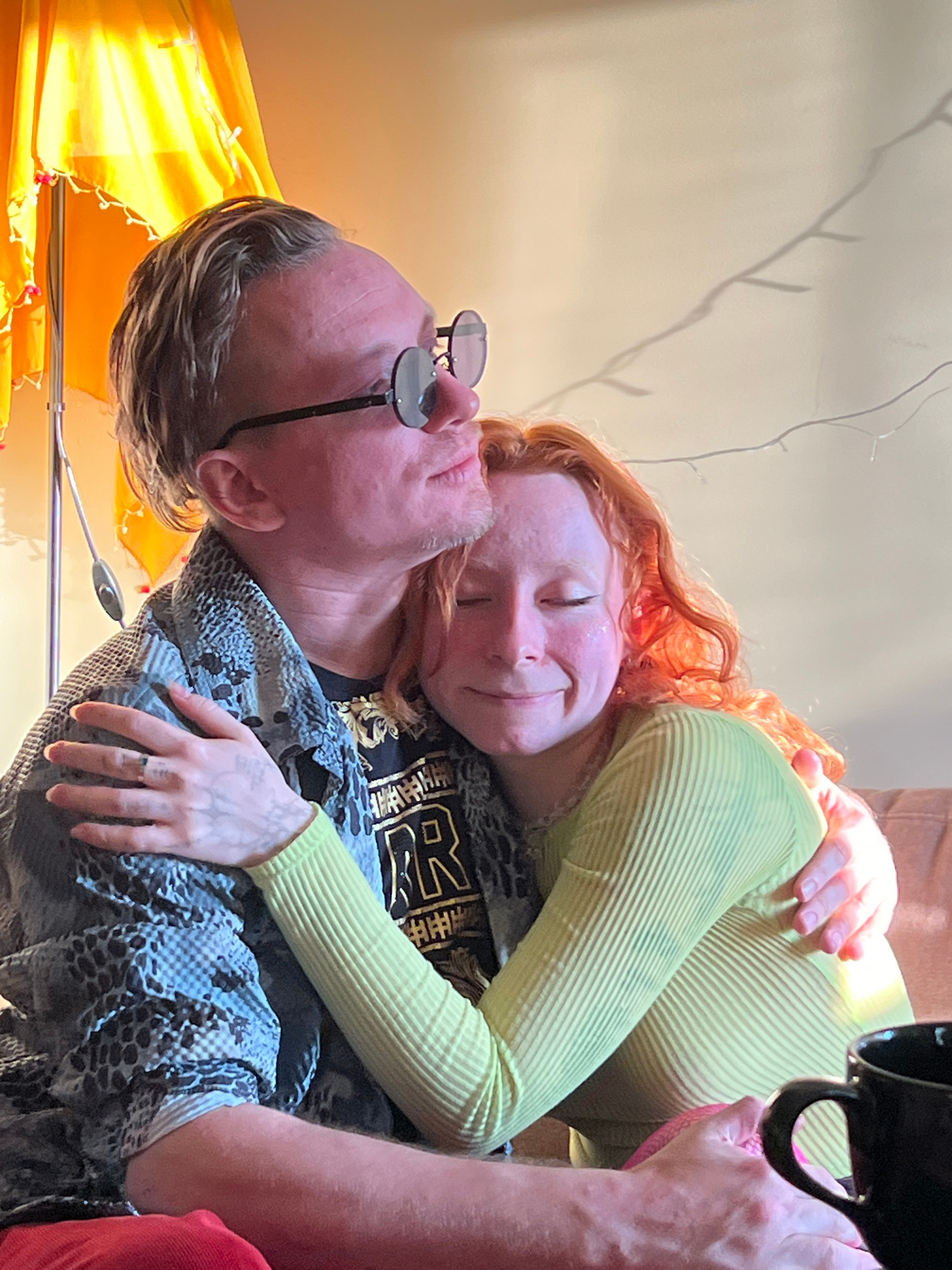 The image depicts a man and a woman indoors. The woman, with red curly hair, is lying down with her head resting on the man's shoulder. She has her eyes closed and is wearing a light green, ribbed lon…read more