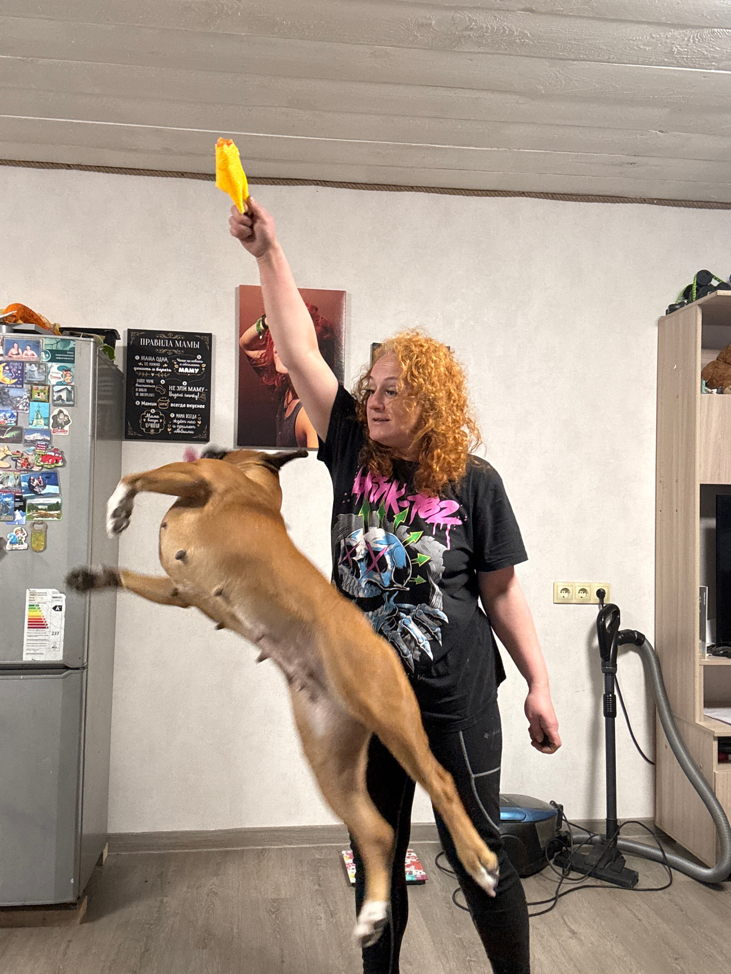 A woman with red curly hair is holding a yellow object, possibly a toy, out to a light brown dog that is mid-jump. They are in an indoor setting with a refrigerator, a poster of a woman, and a sign wi…read more