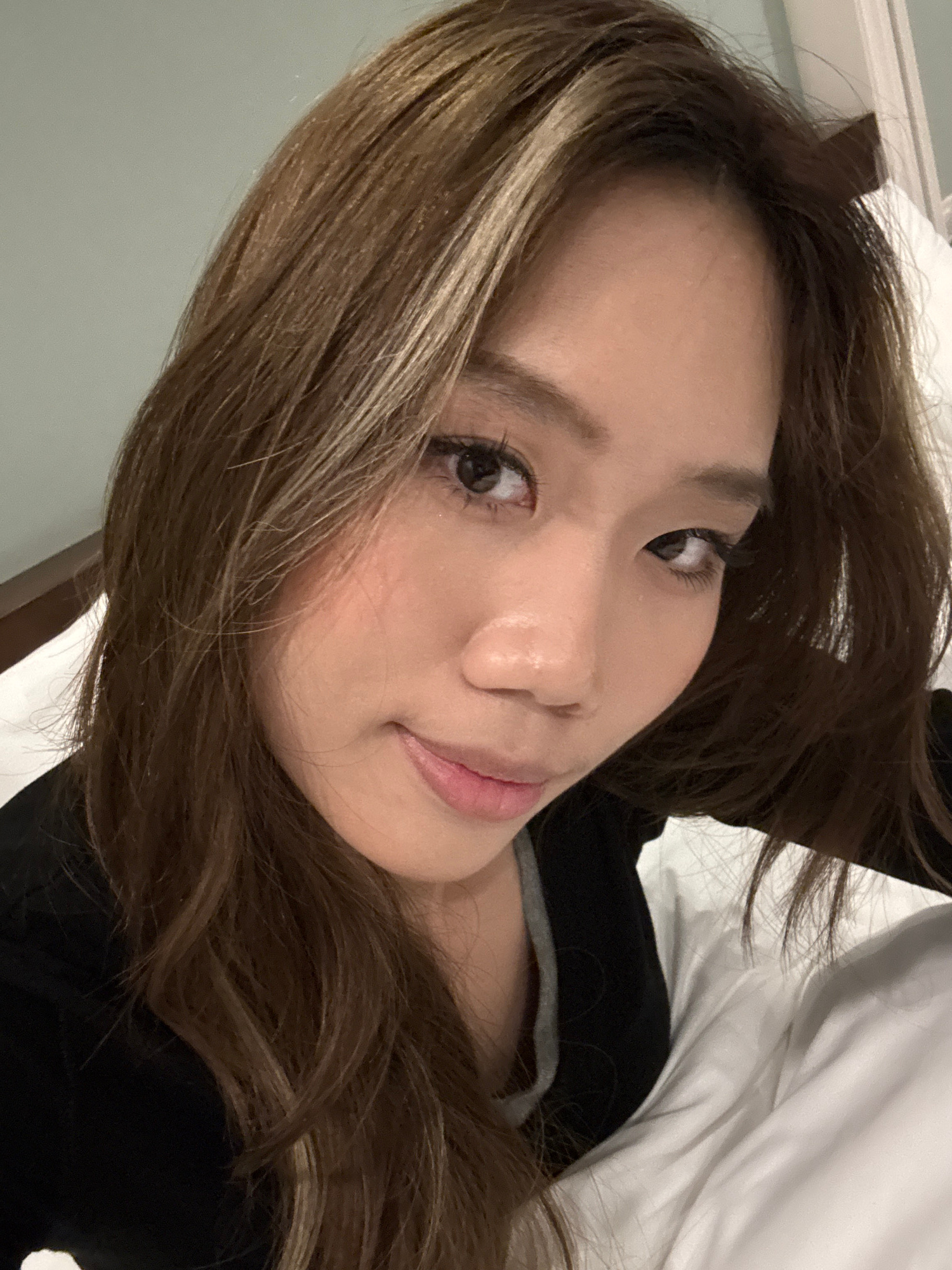 A person is lying on a white pillow in what appears to be a bed. They have light brown hair with highlights. The person is wearing a black top with a gray neckline visible. The background is a light,…read more