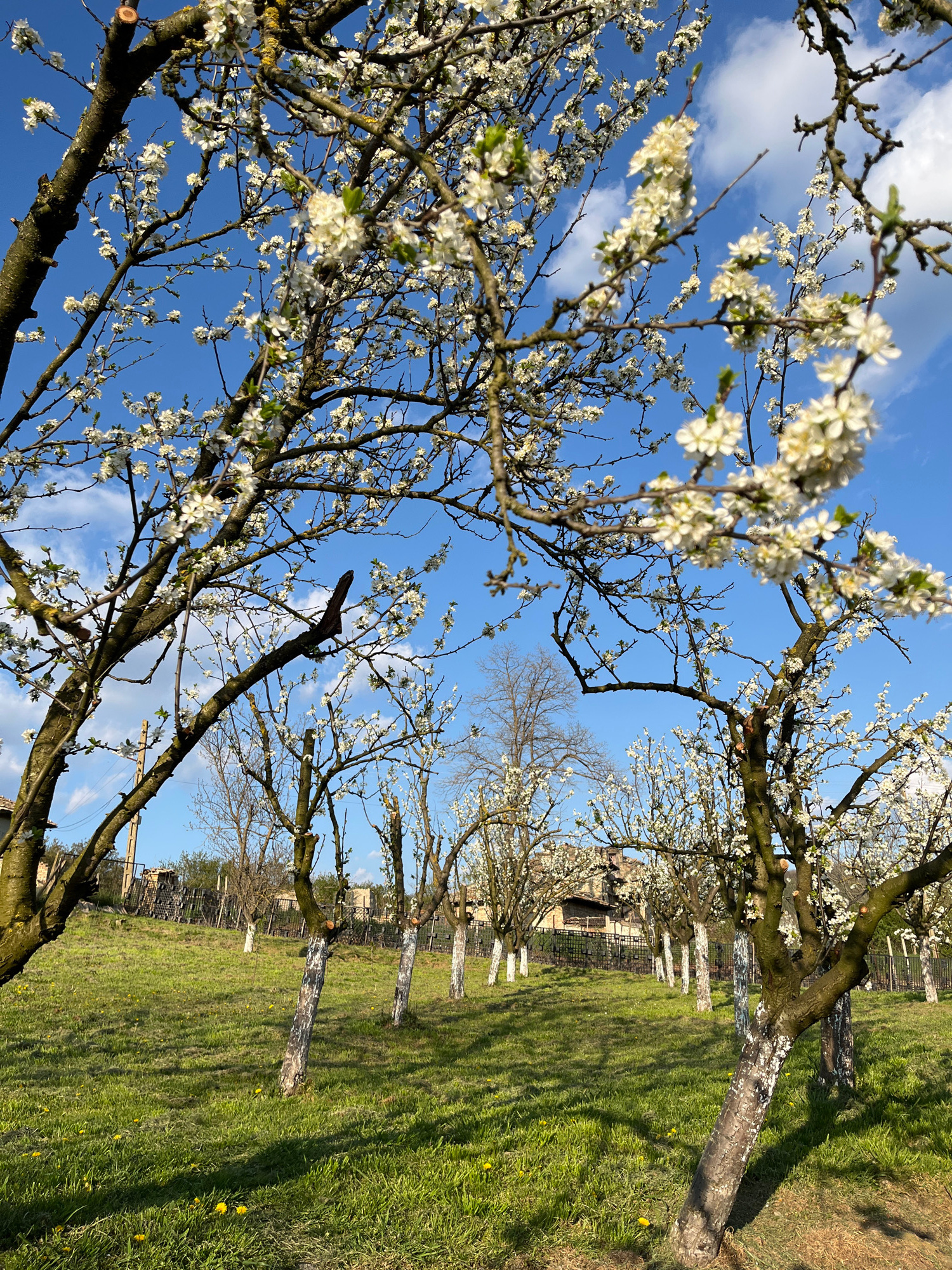 A vibrant outdoor scene captures an orchard in Drinovo, Bulgaria, during springtime. The image is dominated by the branches of several deciduous trees, profusely covered in delicate white blossoms, se…read more