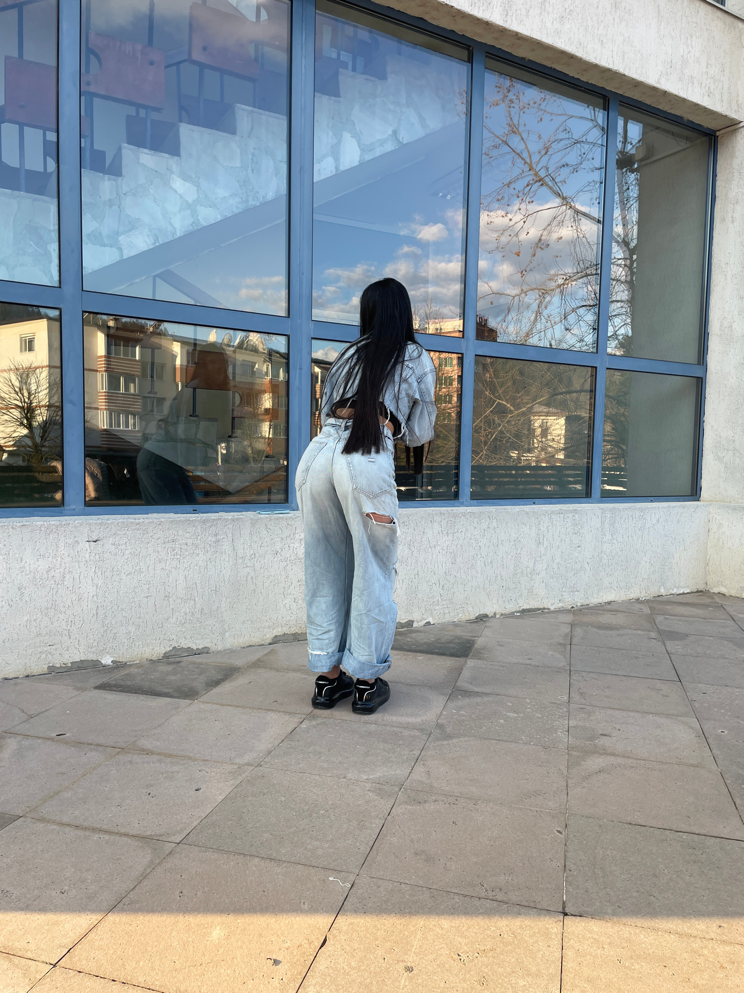 A woman stands outside a building with large paneled windows in Zlatograd, Bulgaria. She is facing the windows, her back to the viewer. She has long, dark hair and wears a denim jacket and ripped jean…read more