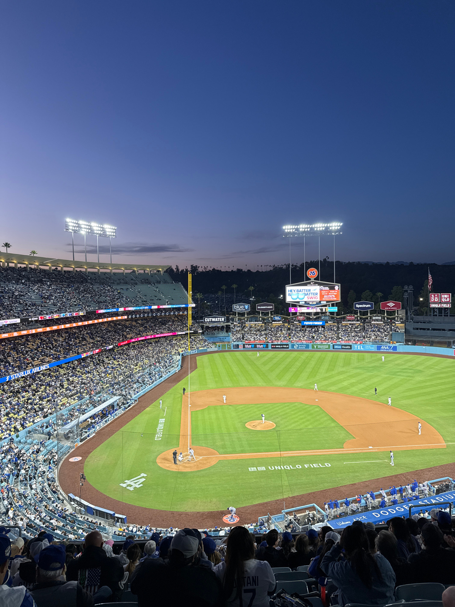 This photograph depicts an aerial view of a baseball game at Dodger Stadium in Los Angeles, United States. The stadium is illuminated by bright overhead lights, contrasting with the twilight sky. The…read more