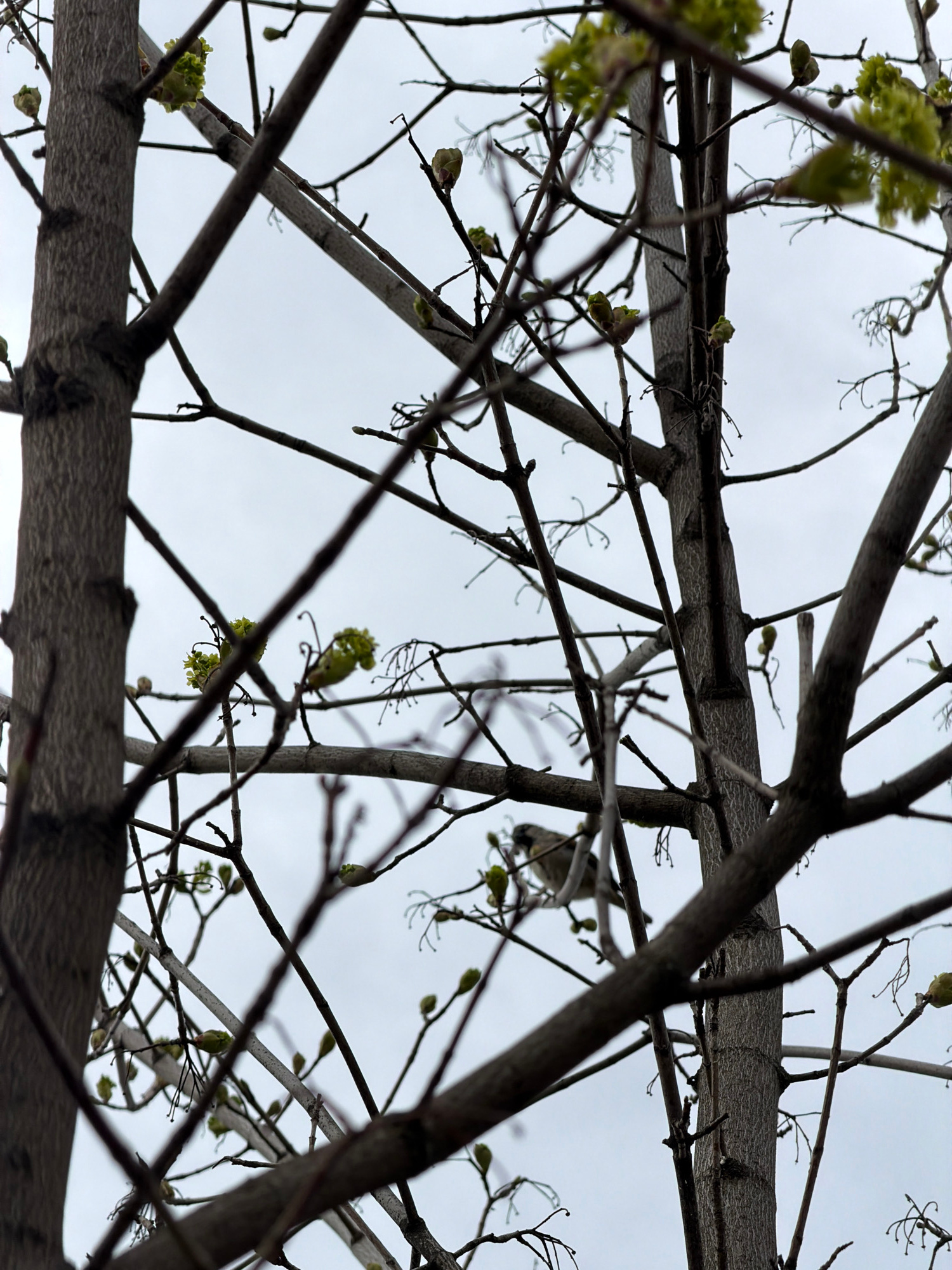 The image shows a view looking upwards through tree branches against a gray sky. The branches are mostly bare, with some small buds and emerging green leaves. The perspective is from directly below th…read more