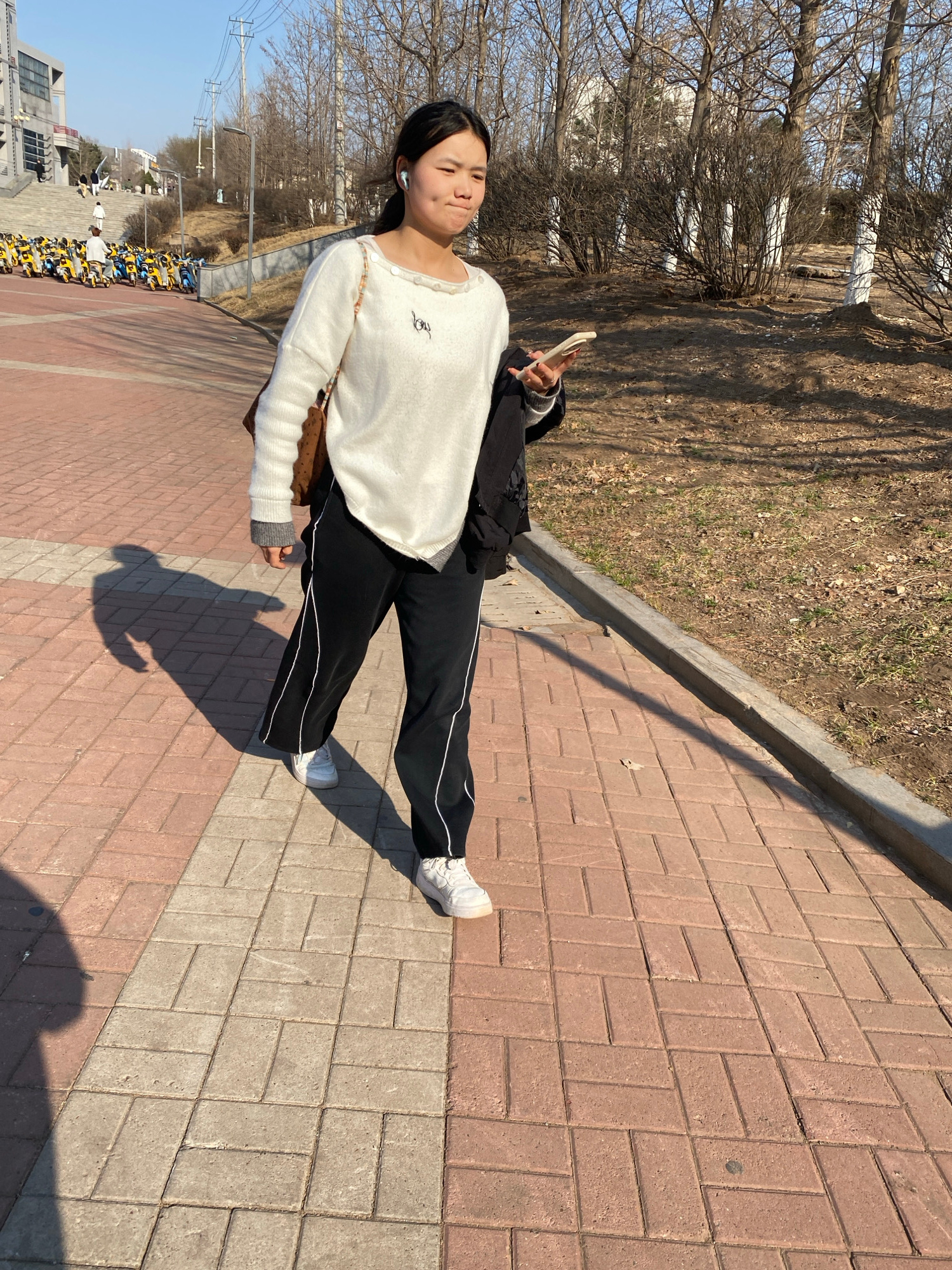 A young woman stands on a brick walkway in Zhongtun, China. She is wearing a white sweater, black pants with white stripes, and white sneakers. She is holding a phone in her right hand. Trees and othe…read more