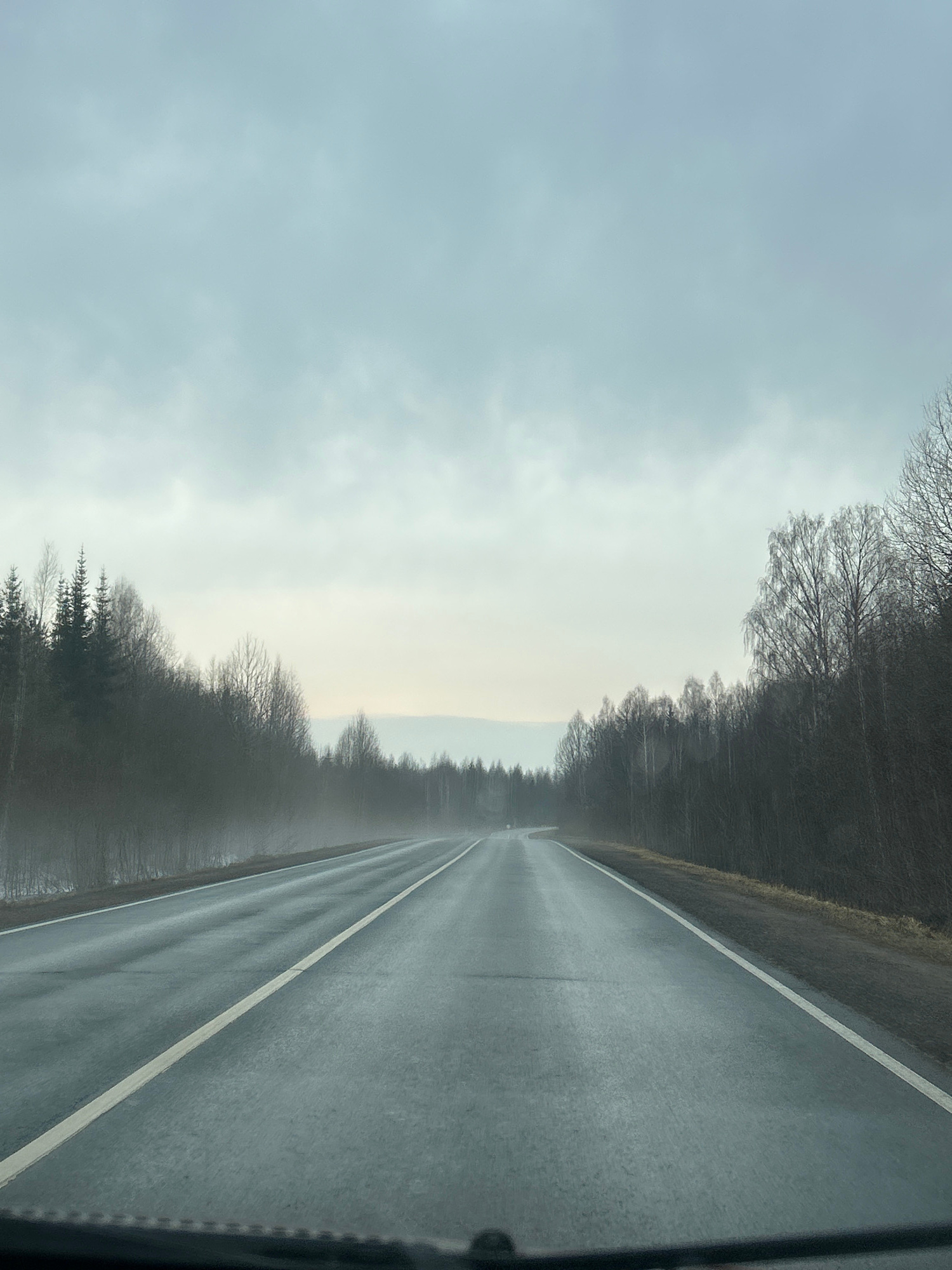 The image depicts a long, straight road stretching into the distance. The road surface appears to be wet, possibly from rain. A white line marks the edge of the road. On either side of the road, dense…read more