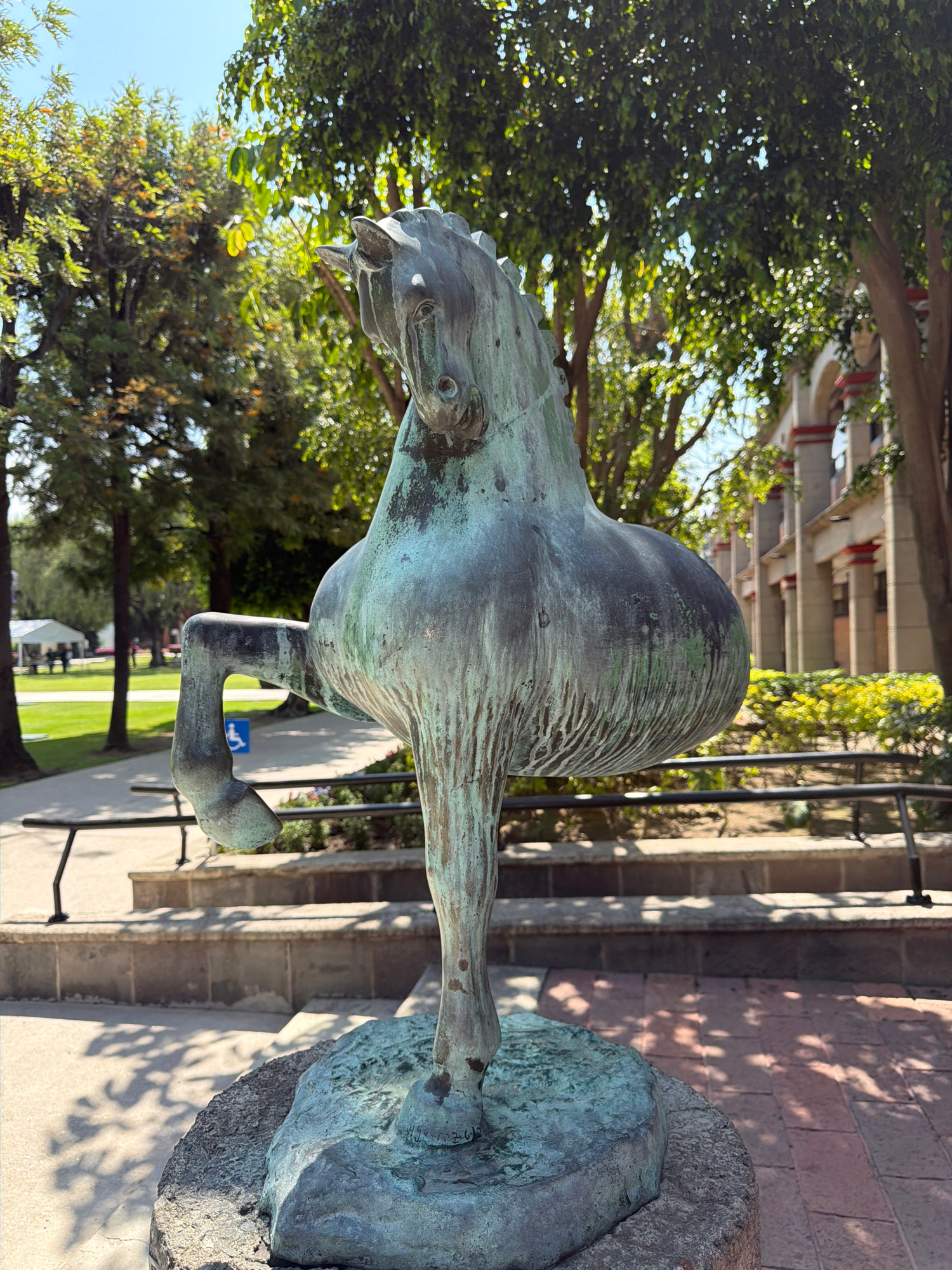 The media file presents a weathered bronze sculpture of a stylized animal, possibly a mythological horse or griffin, set outdoors. The sculpture, exhibiting a greenish-blue patina, stands on a rough s…read more