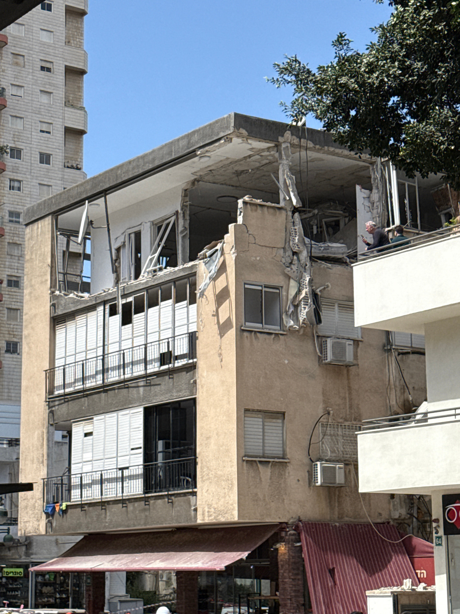 The image shows a damaged building in Ramat Gan, Israel. The building's facade is severely cracked and partially collapsed, with exposed concrete and metal reinforcements. Several windows are broken o…read more