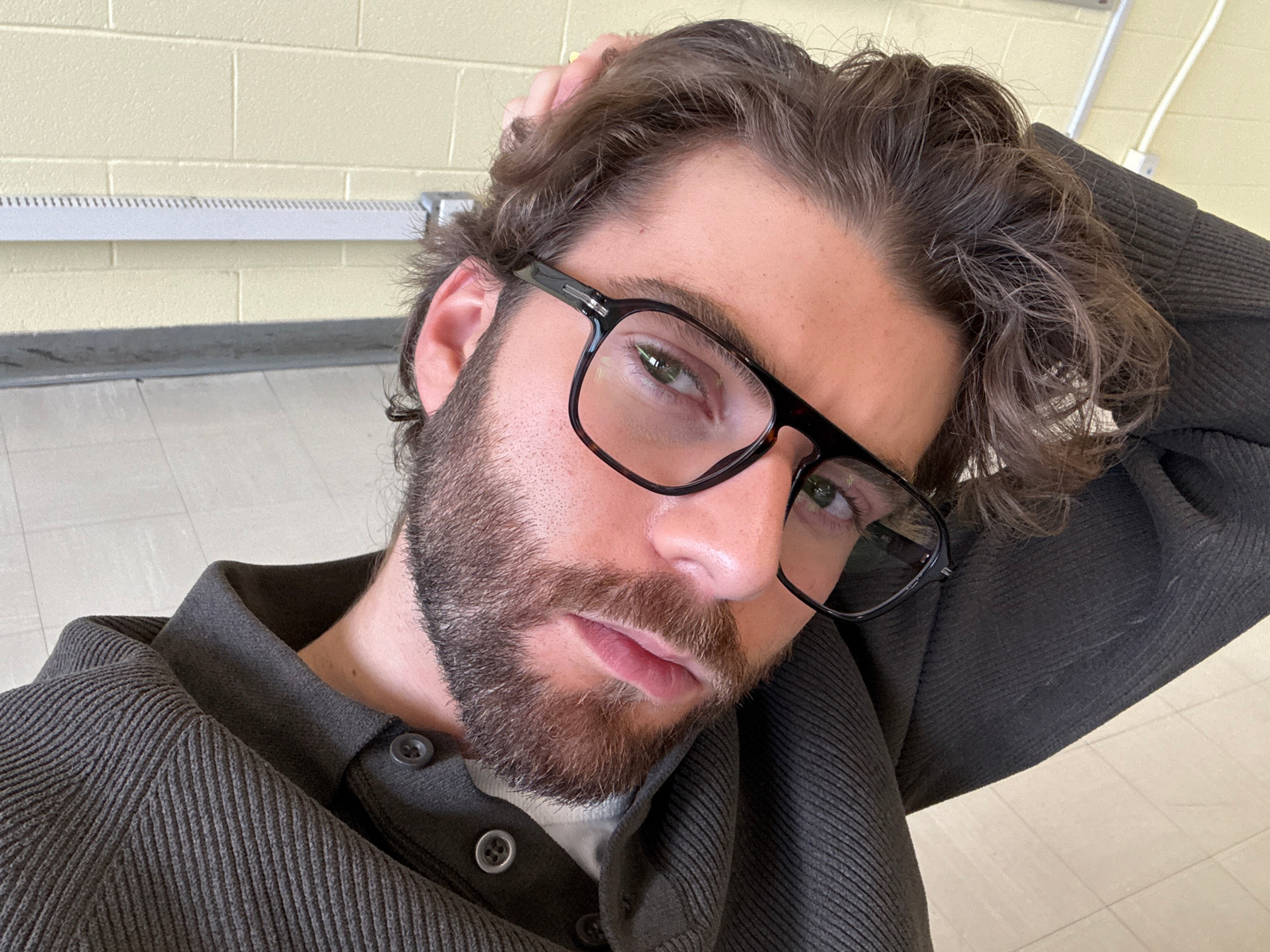 This close-up, rotated portrait captures a young adult male, shown upside down, with a neutral expression as he gazes directly at the camera. He has light skin, green eyes, and wears dark-framed, rect…read more