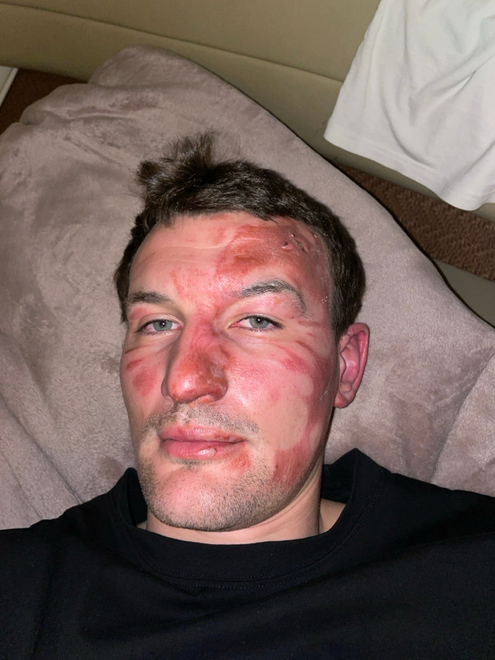 The scene depicts an adult male in an indoor setting in Sochi, Russia, resting on a light brown, textured pillow or cushion. He is positioned facing the viewer, with his head slightly elevated. The in…read more