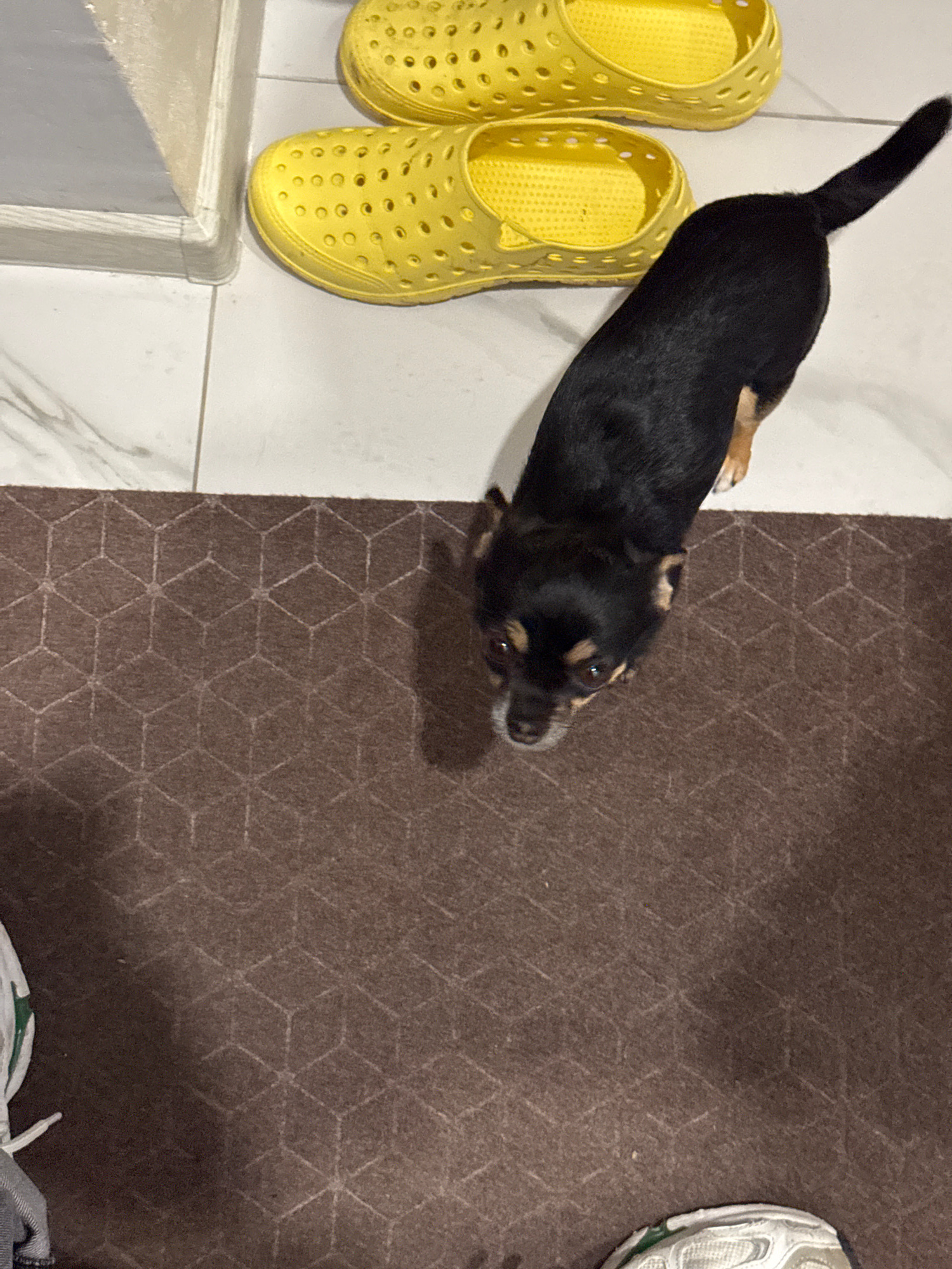 The scene presents an indoor setting where a small, predominantly black dog with tan markings is positioned between a white tiled floor and a brown rug with a geometric pattern. The dog appears to be…read more