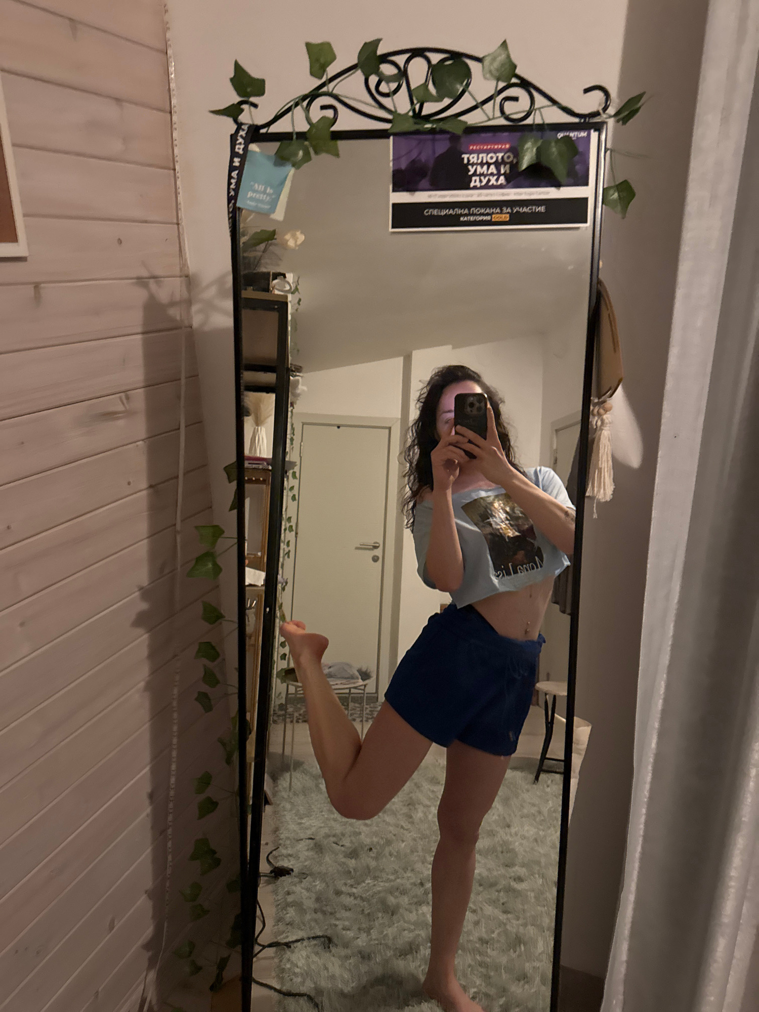 A young woman is visible in the reflection of a large, ornate mirror. She is holding a smartphone, presumably taking a photo of herself. The woman is wearing a light blue t-shirt and dark blue shorts.…read more