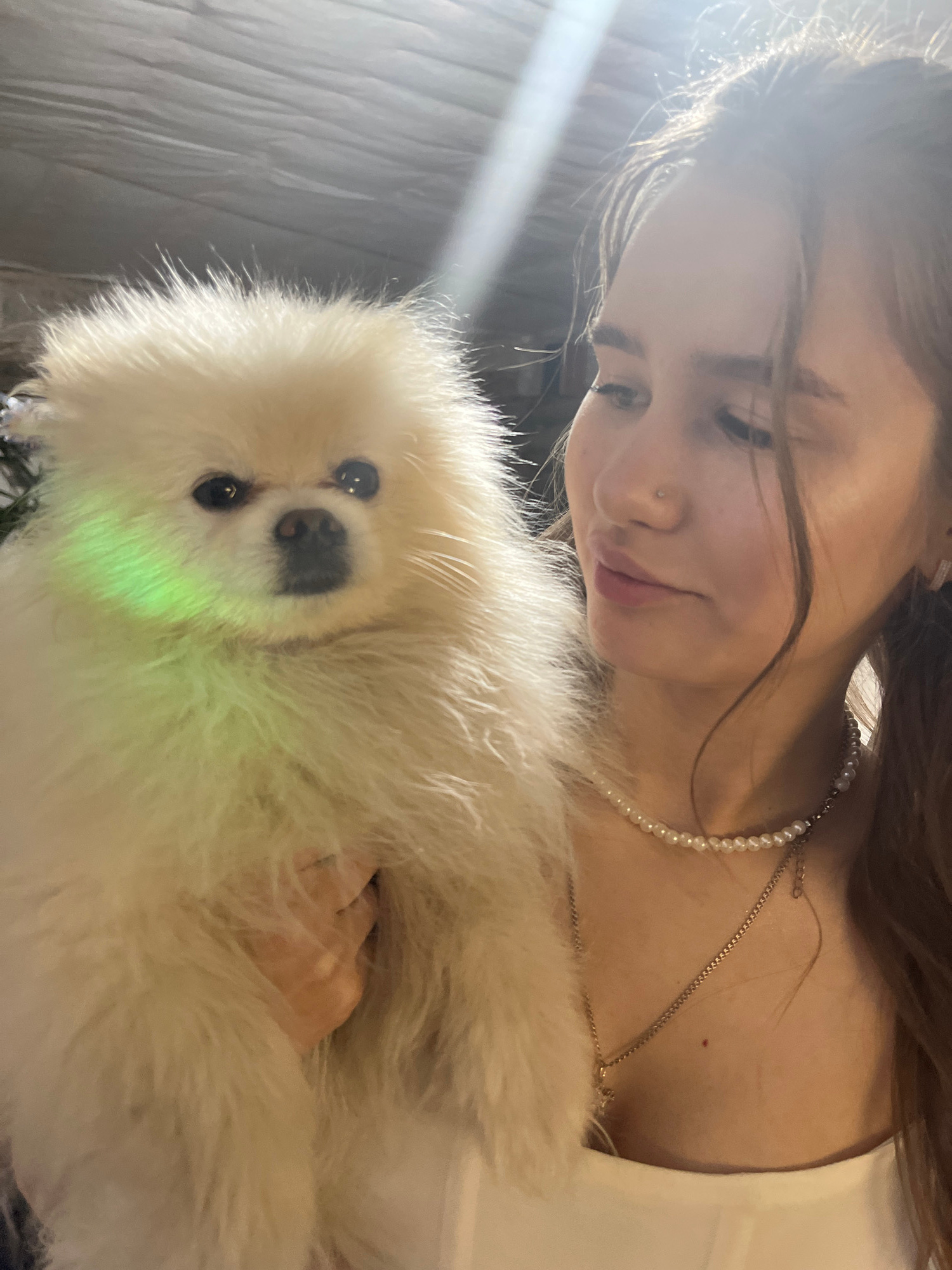 A woman is holding a white dog. The woman has brown hair and is wearing a pearl necklace and gold chain. The dog is small and fluffy. There is a bright light source visible on the left side of the ima…read more