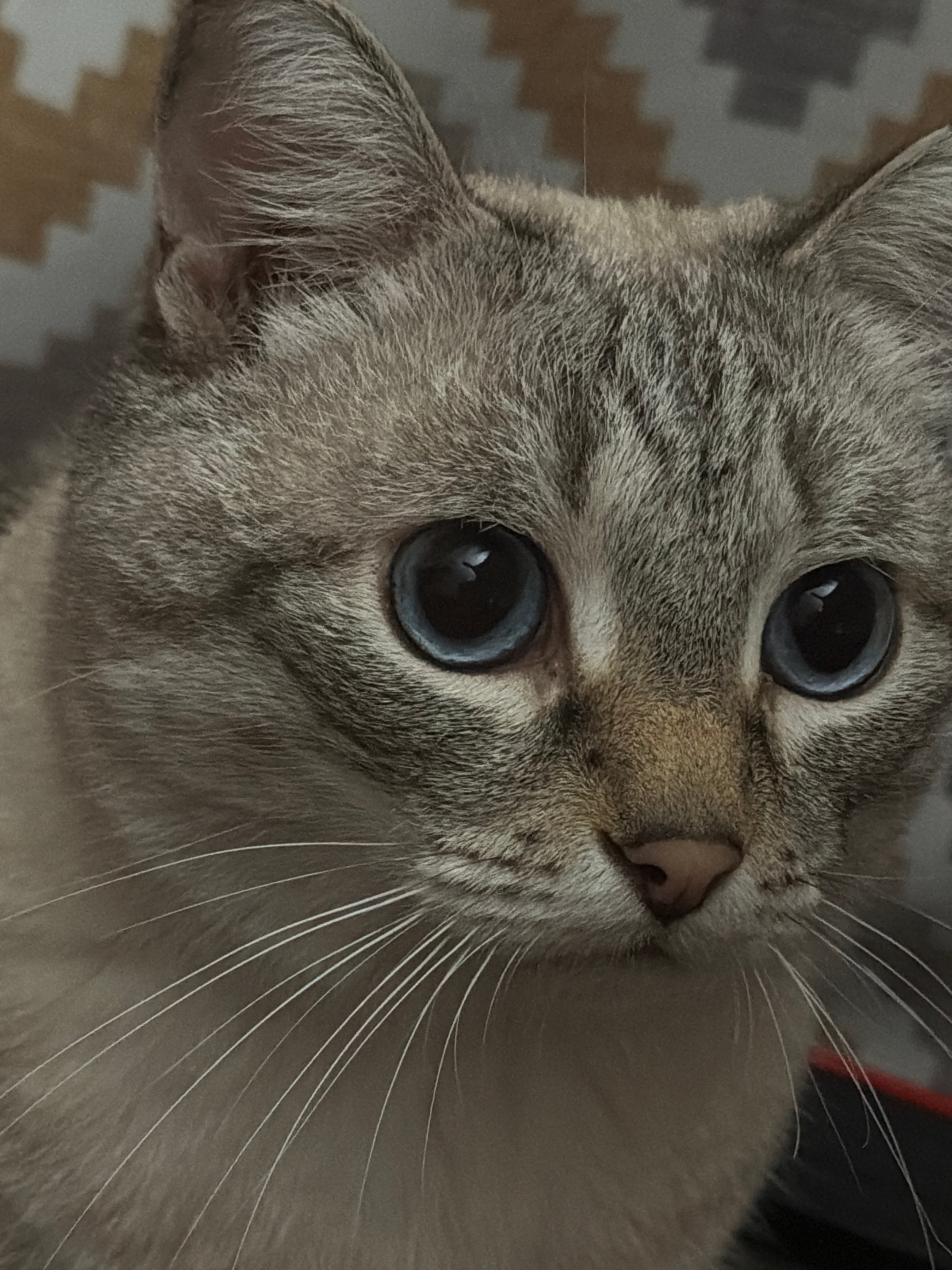 A close-up photograph depicts the face of a cat. The cat has blue eyes, gray fur, and white whiskers. The background shows a portion of a gray and beige patterned surface. The cat is the sole subject…read more