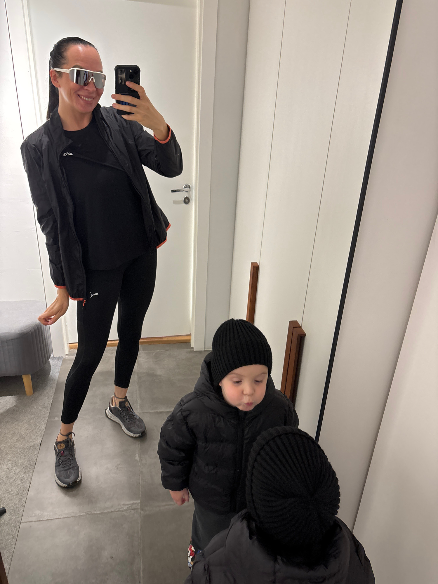 The image shows a woman taking a selfie in a dressing room. The location is likely a store fitting room. The woman is wearing sunglasses, a black jacket, black leggings, and running shoes. Beside her,…read more