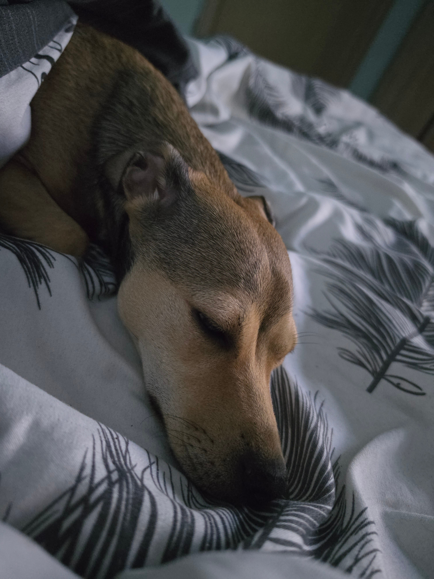 A close-up shot depicts a brown and tan dog peacefully sleeping or resting on a bed or couch. The dog's head and neck are the primary focus, with its eyes gently closed, conveying a sense of deep rela…read more