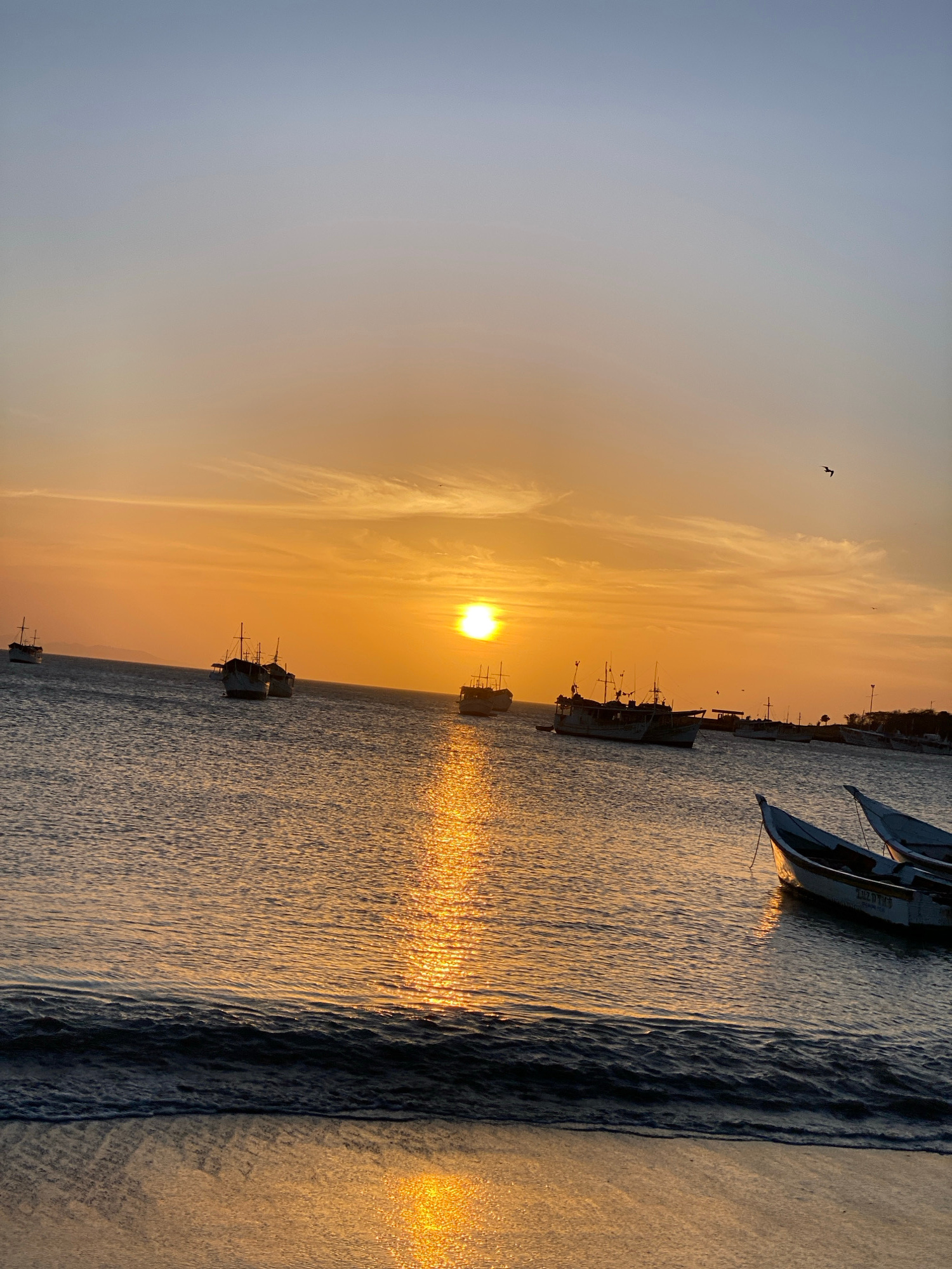 The image shows a sunset scene in Juan Griego, Venezuela. The sun is low in the sky, casting a golden reflection on the water. There are several boats anchored in the harbor. A bird is flying in the sā¦read more