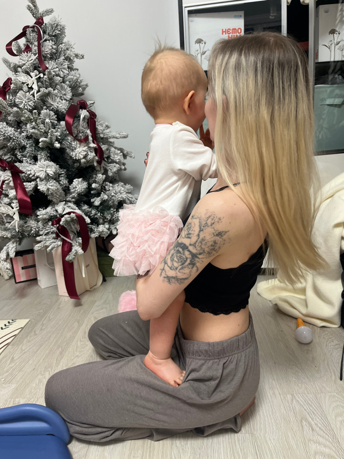 A woman kneels on the floor, embracing a baby dressed in a white onesie with a pink tutu. The woman has long blonde hair and a tattoo on her upper arm. A decorated Christmas tree is visible, along wit…read more