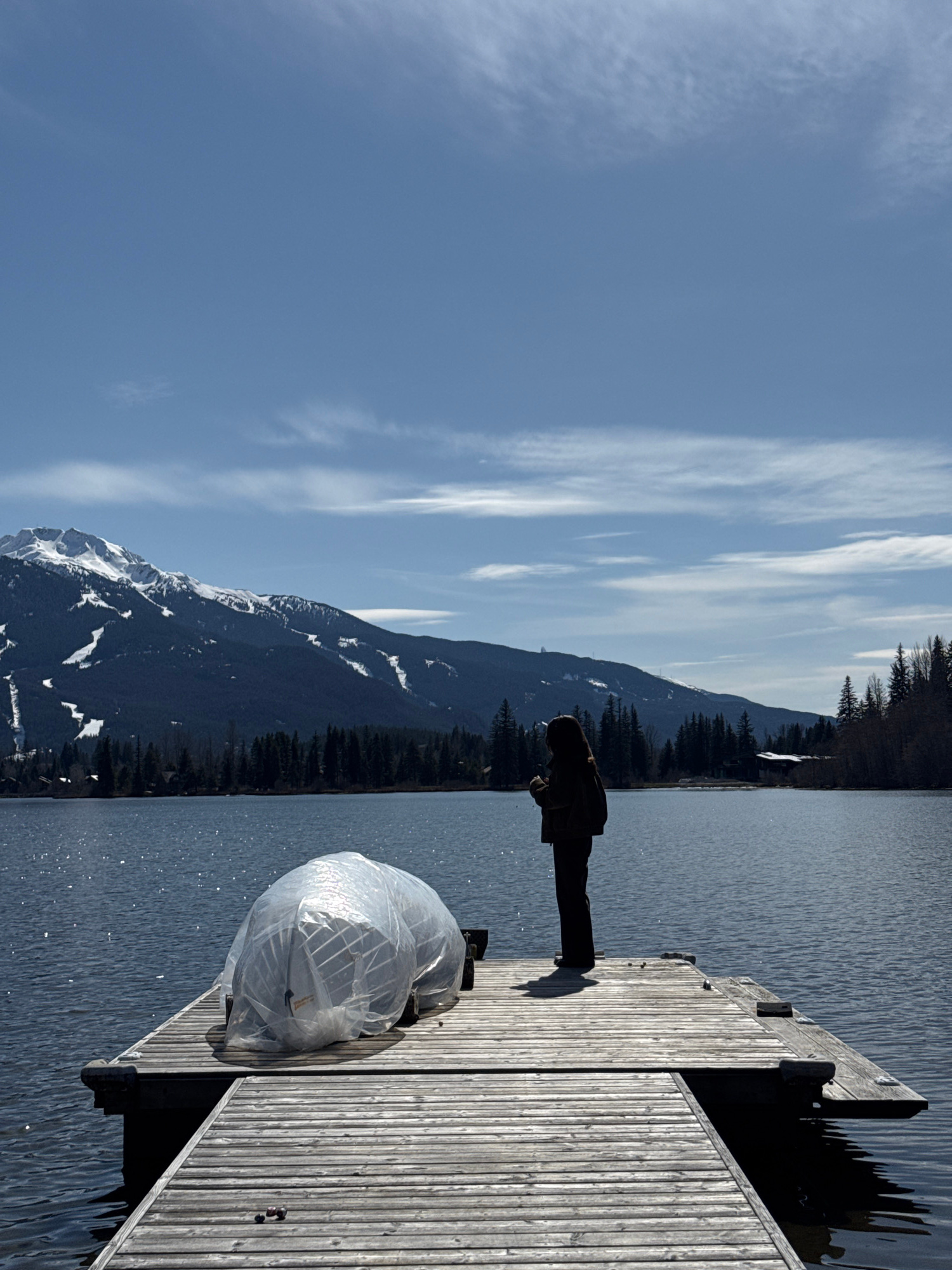 The image shows a dock extending into a lake, likely in Whistler, Canada, given the mountainous backdrop with snow-capped peaks and evergreen forests. A figure stands on the dock, observing the water.…read more