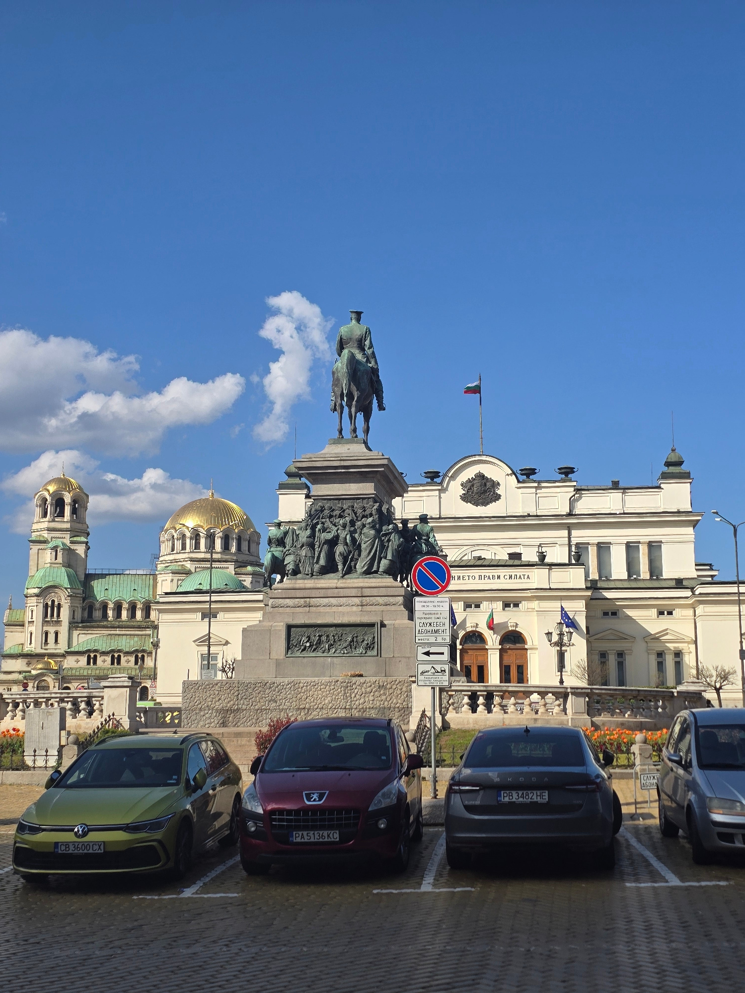 A bright, sunny street scene in Sofia, Bulgaria, captured during daylight hours, features a prominent equestrian statue and several notable architectural landmarks. The image is composed of a clear bl…read more