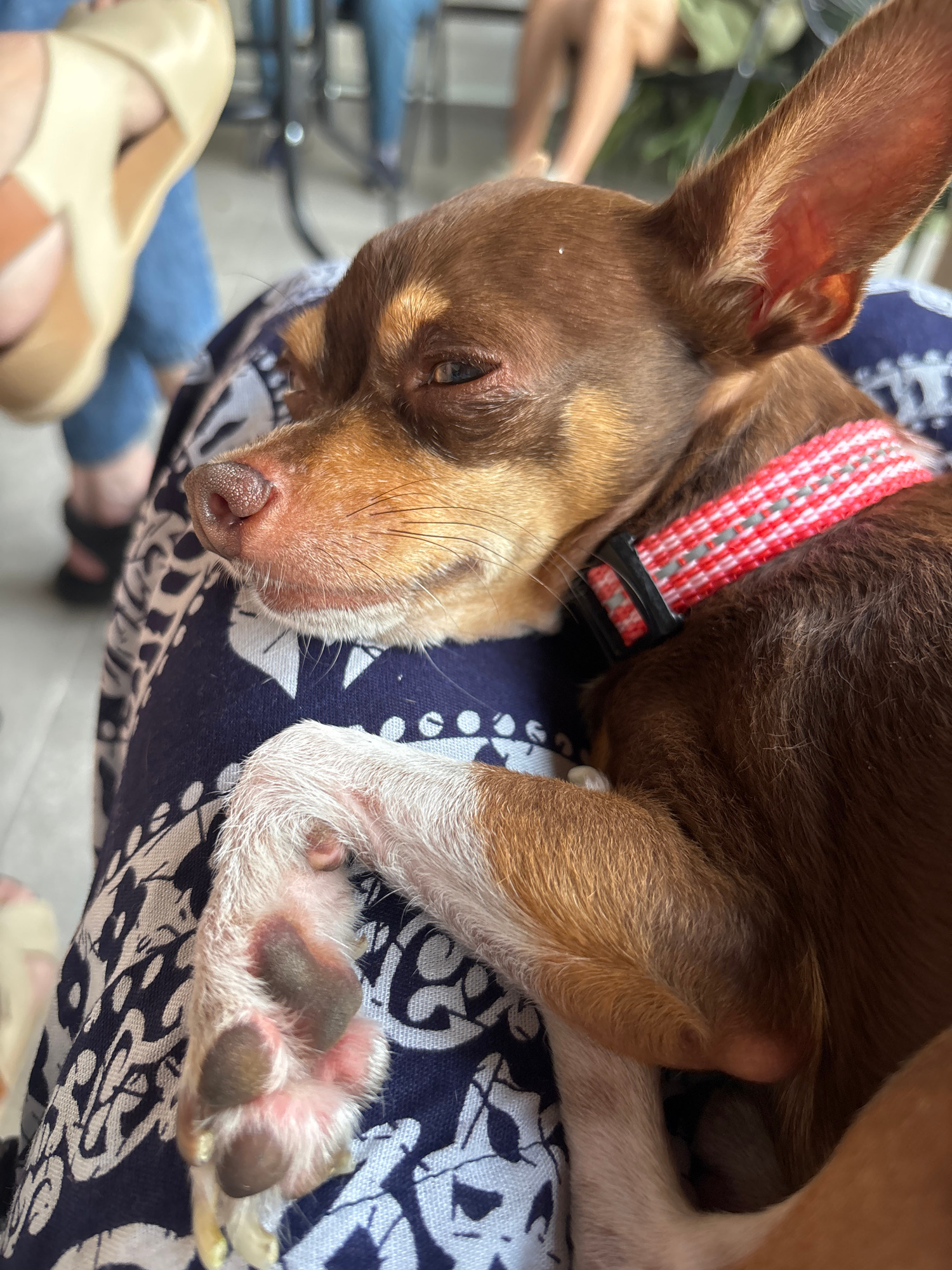 A brown and tan Chihuahua with a red and grey collar rests on a lap covered in a blue and white patterned garment. The dog's head is turned to the left, with one ear prominent and an eye partially ope…read more