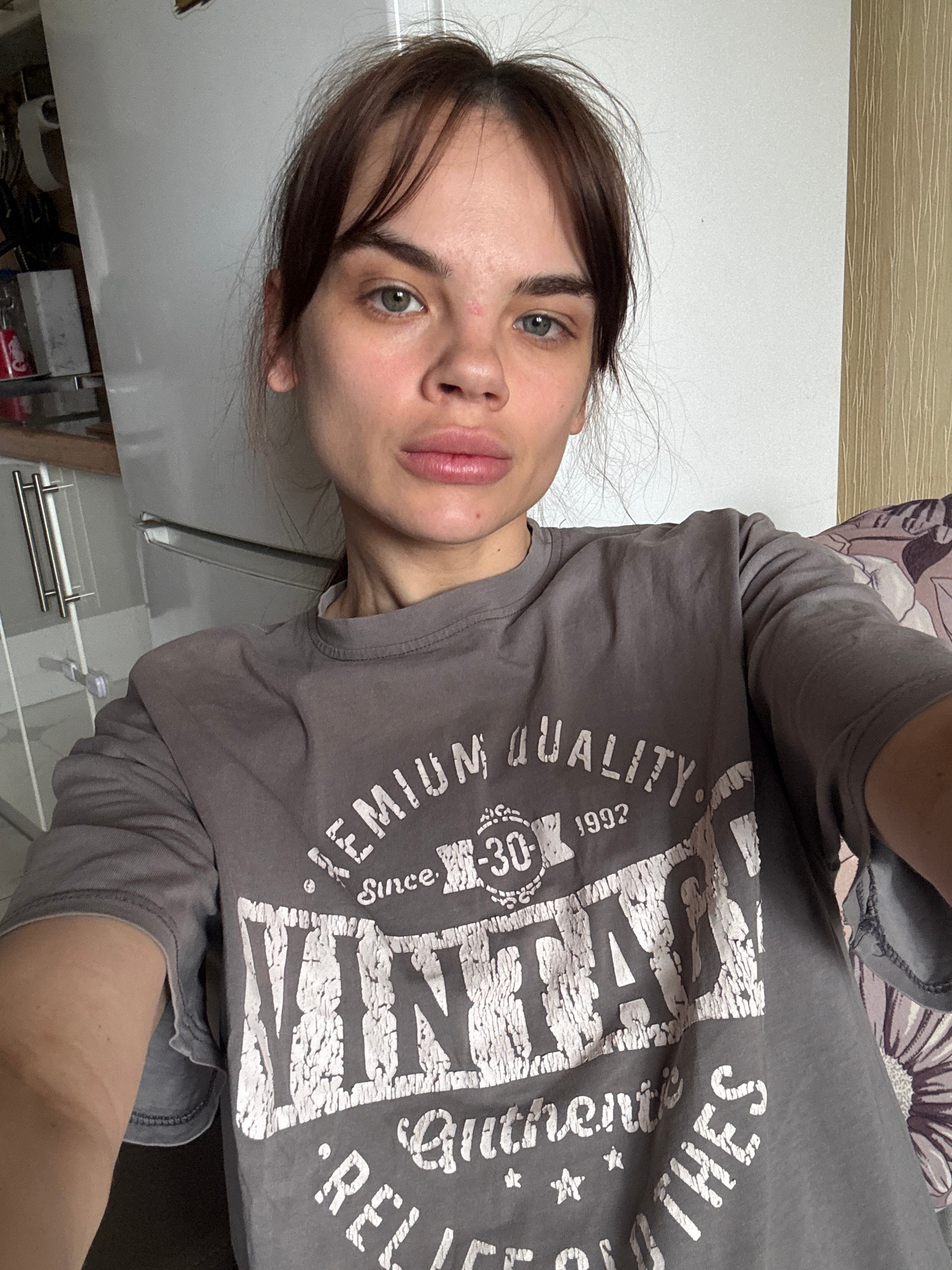 A person with light skin, brown hair, and blue-green eyes is positioned in front of what appears to be a kitchen. The person is wearing a gray long-sleeved t-shirt with a graphic print in white. The s…read more