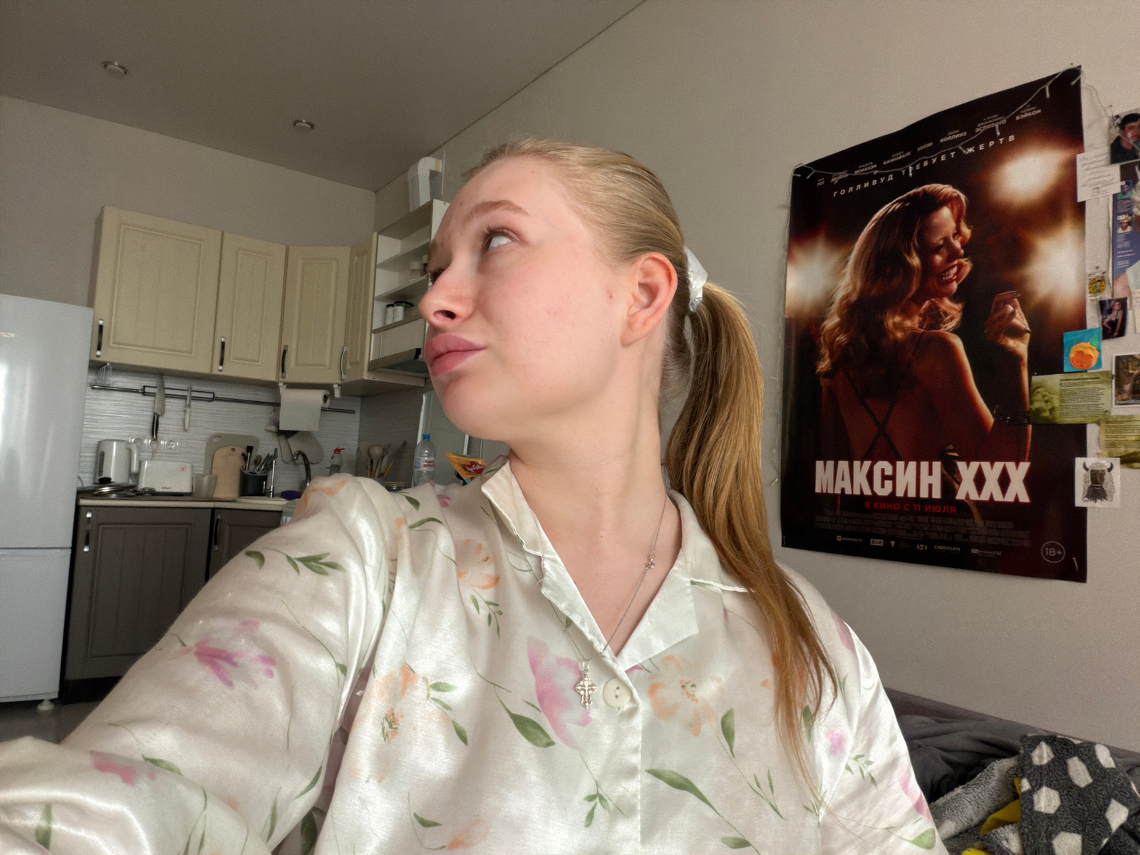 The image captures an indoor scene, likely within an apartment or home in Zasechnoye, Russia. The primary subject is a young woman, partially visible, centered in the frame. She has fair skin and ligh…read more