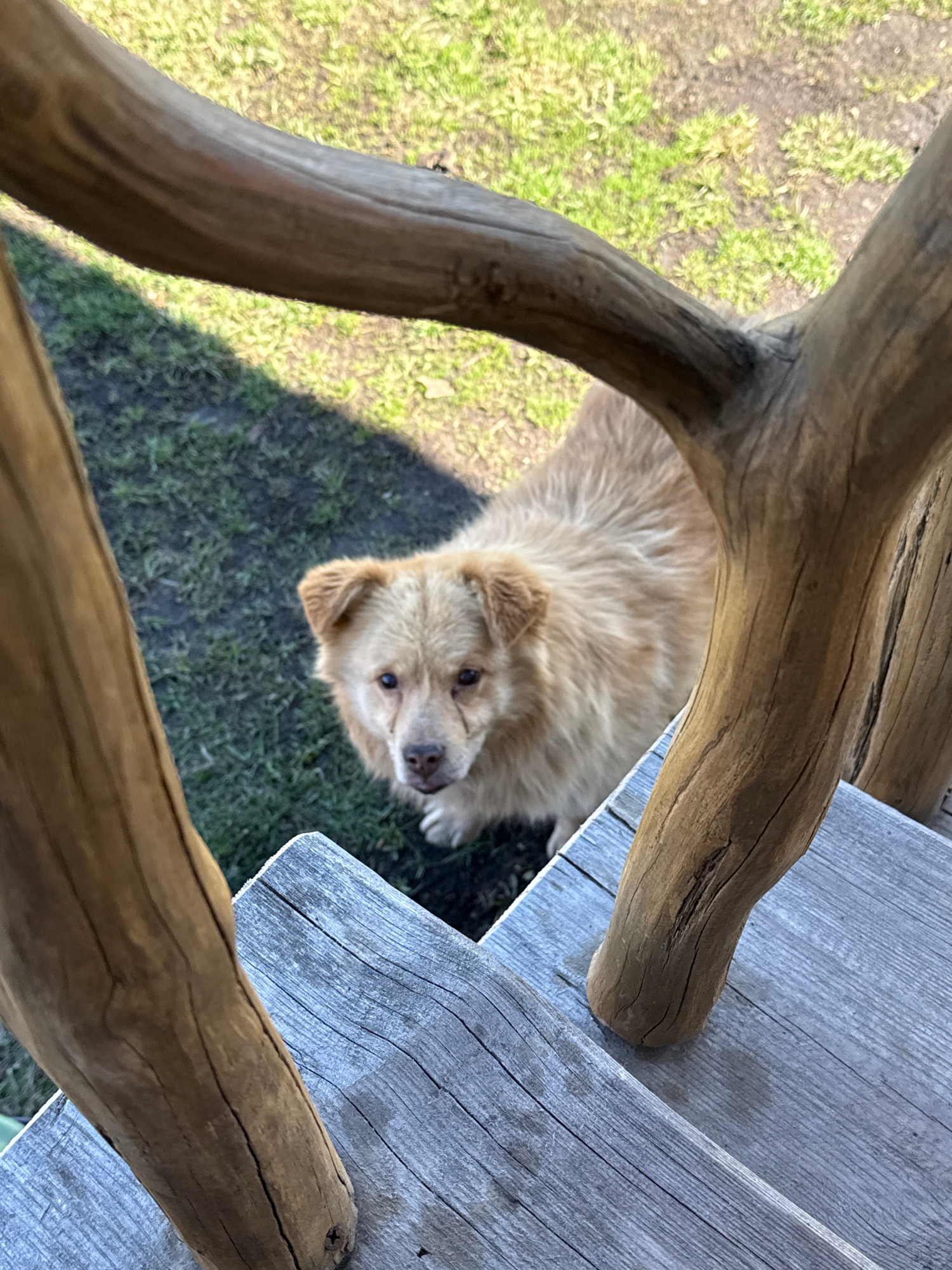A medium shot, captured from a high angle, shows a furry, tan-colored dog with small floppy ears and dark eyes. The dog is partially obscured by rustic wooden logs and a wooden platform, suggesting an…read more