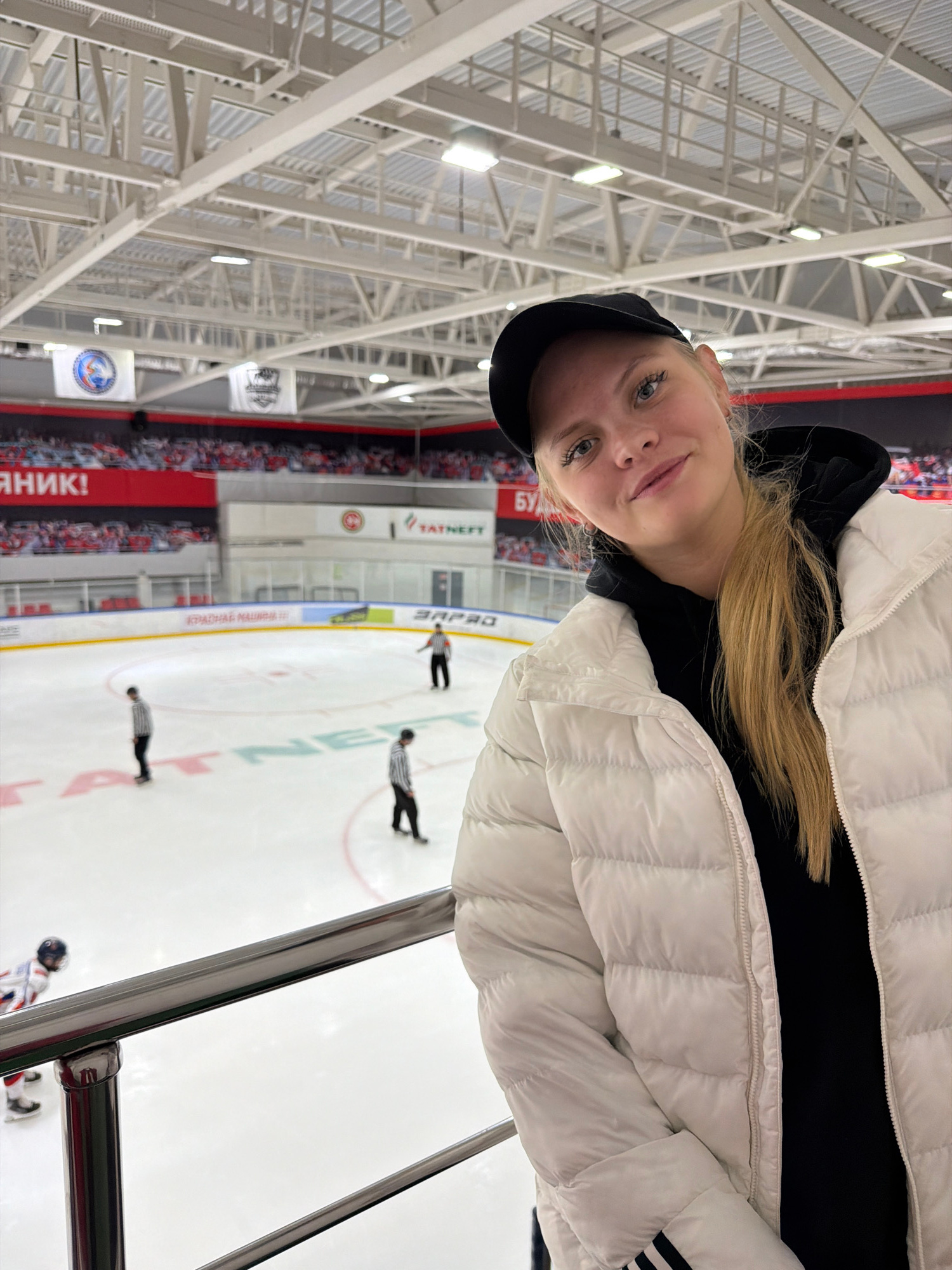 A slightly canted medium shot captures a young, fair-skinned woman with blonde hair and blue eyes, wearing a black hoodie, a white puffy jacket with Adidas stripes, and a black baseball cap. She is sm…read more