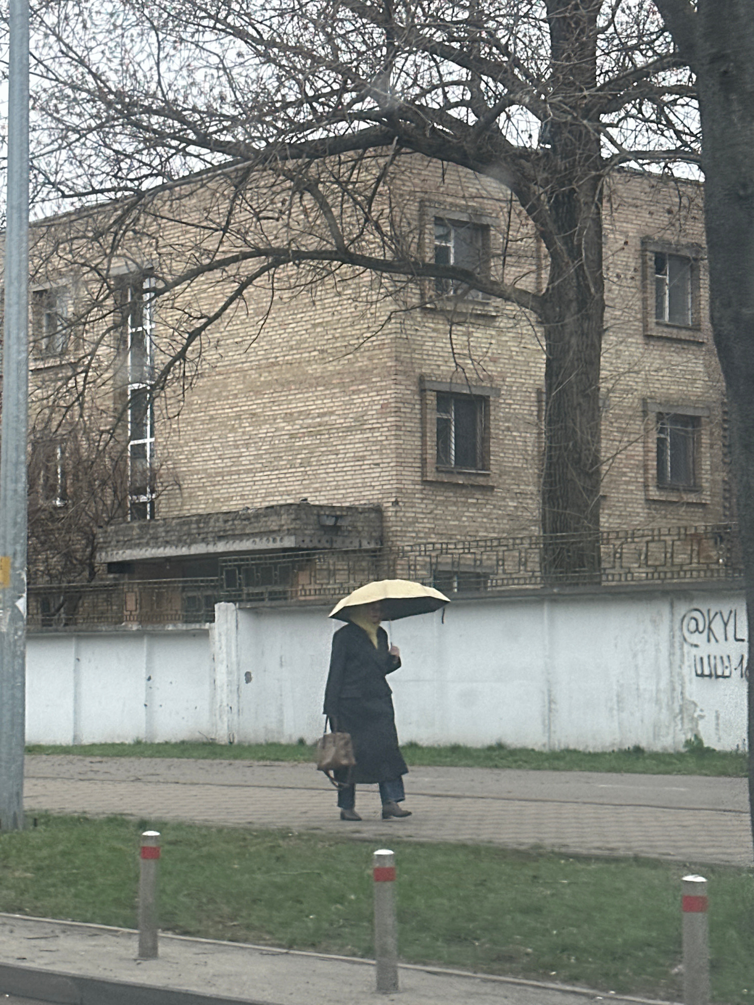 The image shows a person walking with a yellow umbrella on a sidewalk next to a brick building in Kyiv, Ukraine. The building is multi-story with several windows, and a fire escape. A bare tree standsβ¦read more