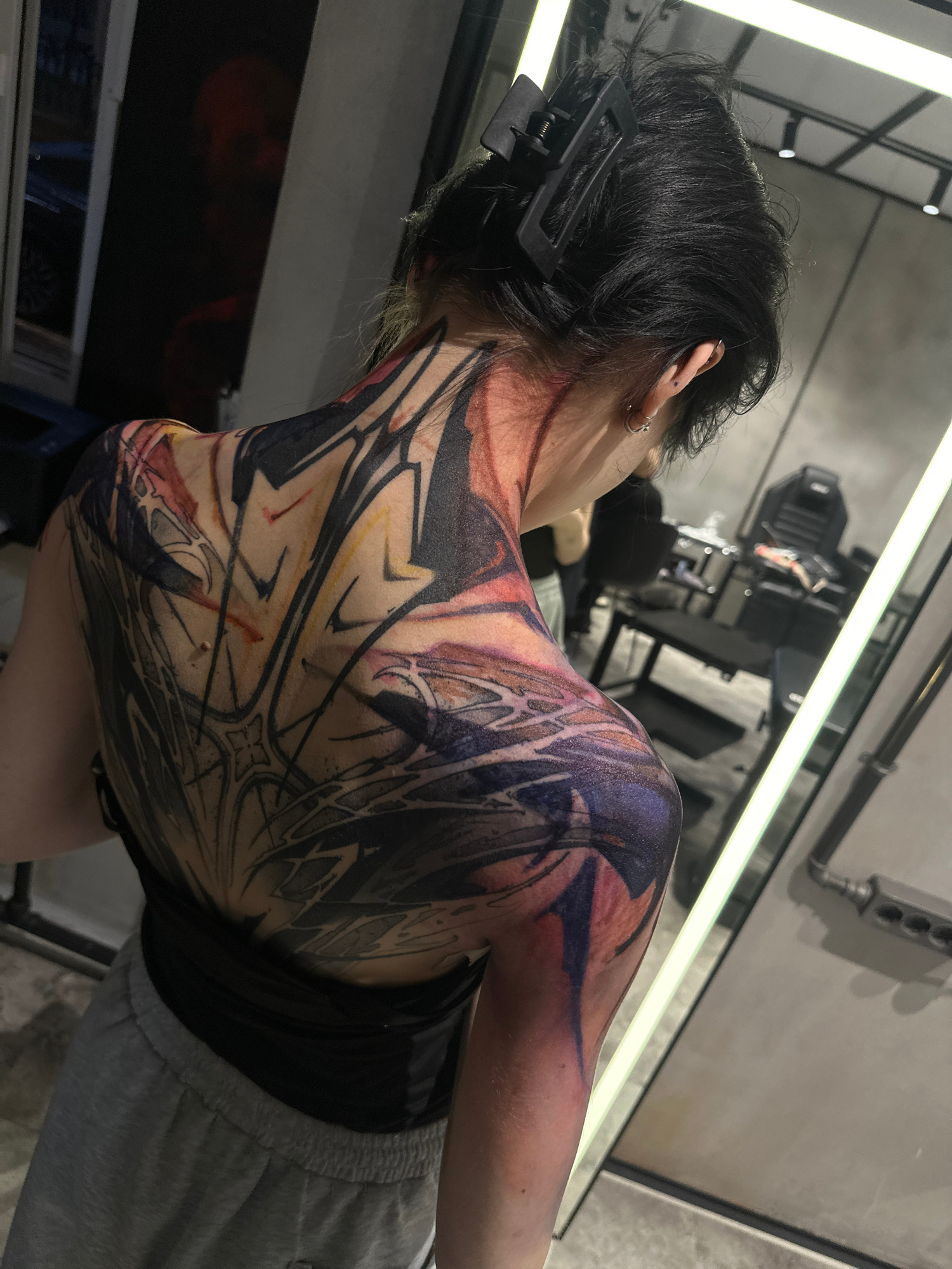 A person is seen from behind, with their upper back and shoulder covered in a large, colorful tattoo. The person has short, dark hair held back with a black clip. They are wearing a black tank top and…read more