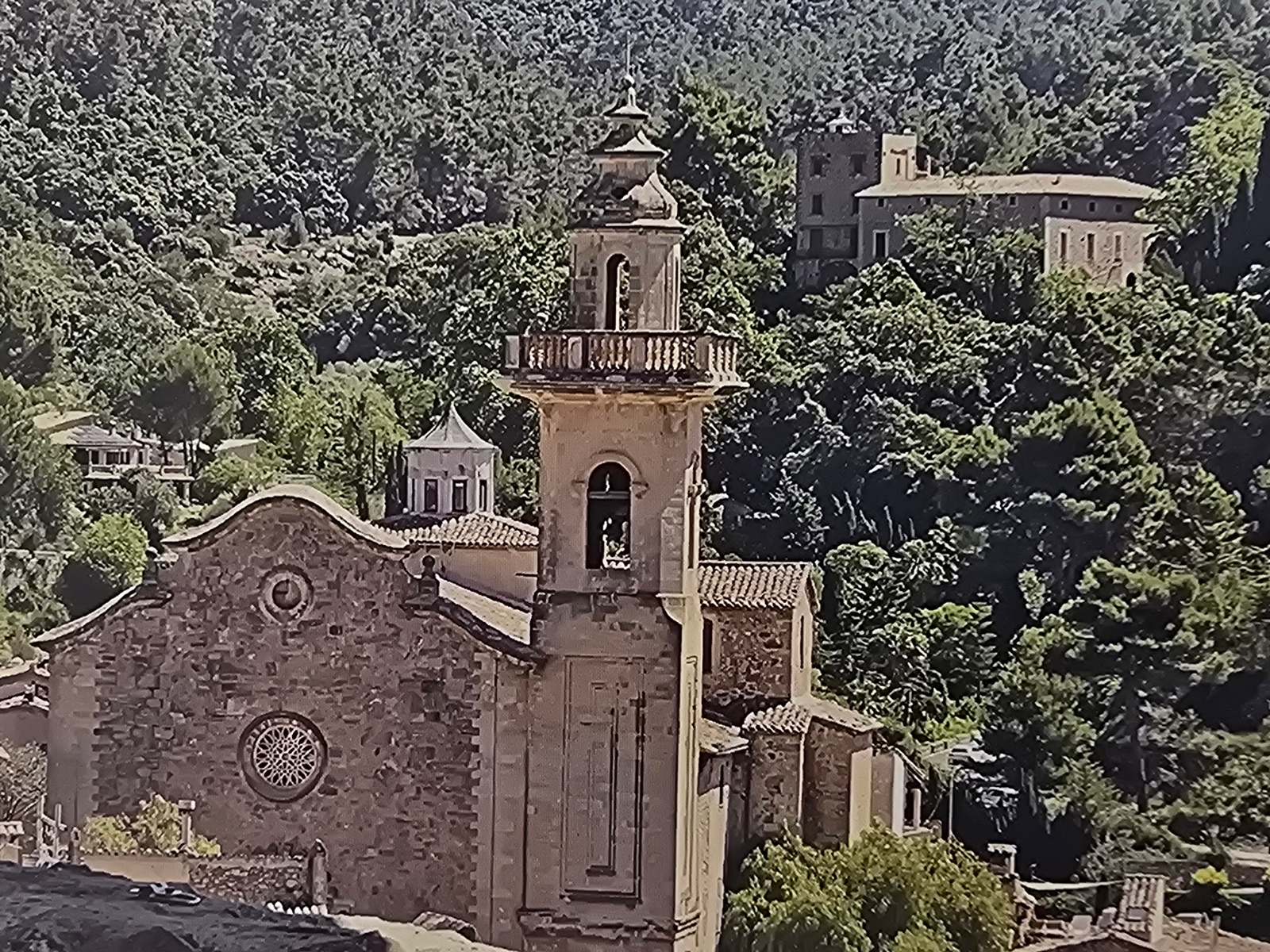 The central subject of the image is a stone church featuring a prominent bell tower with a balustraded upper level and a small domed spire. The church facade exhibits a large, ornate rose window and a…read more