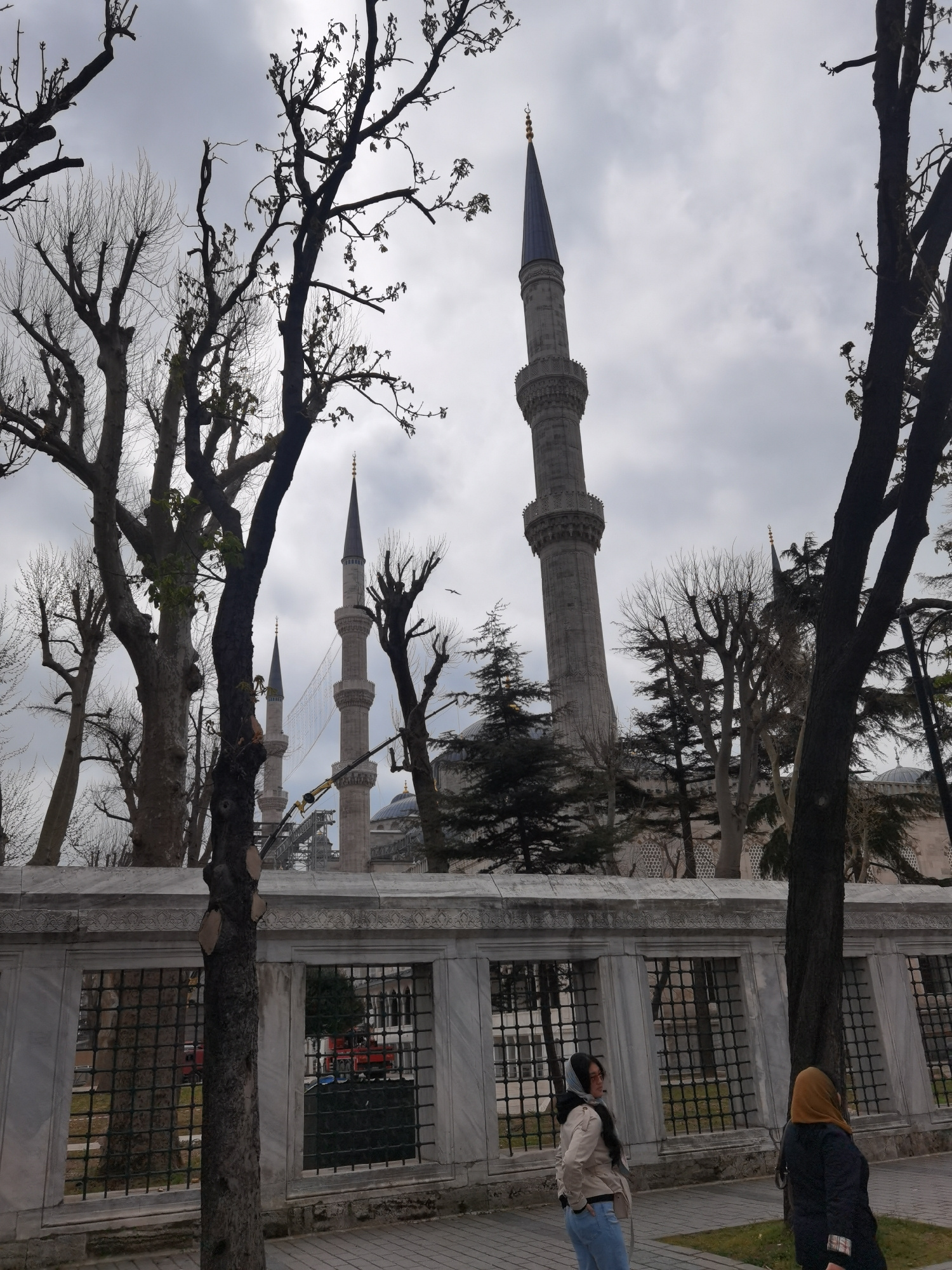 This outdoor image captures a majestic mosque with towering minarets in Istanbul, Turkey, viewed through a foreground of numerous bare trees. The sky is overcast and cloudy, indicating a non-sunny day…read more