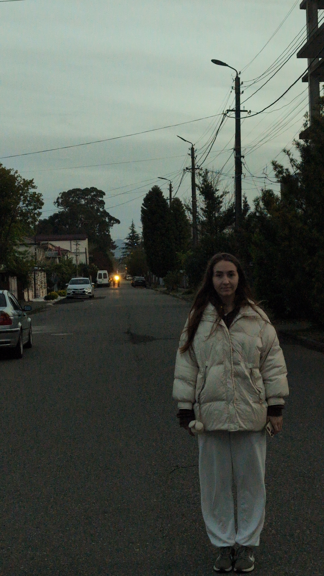 A person stands on an asphalt road in Kobuleti, Georgia. The individual is wearing a light-colored puffer jacket, light-colored pants, and sneakers. The road stretches into the distance with several c…read more
