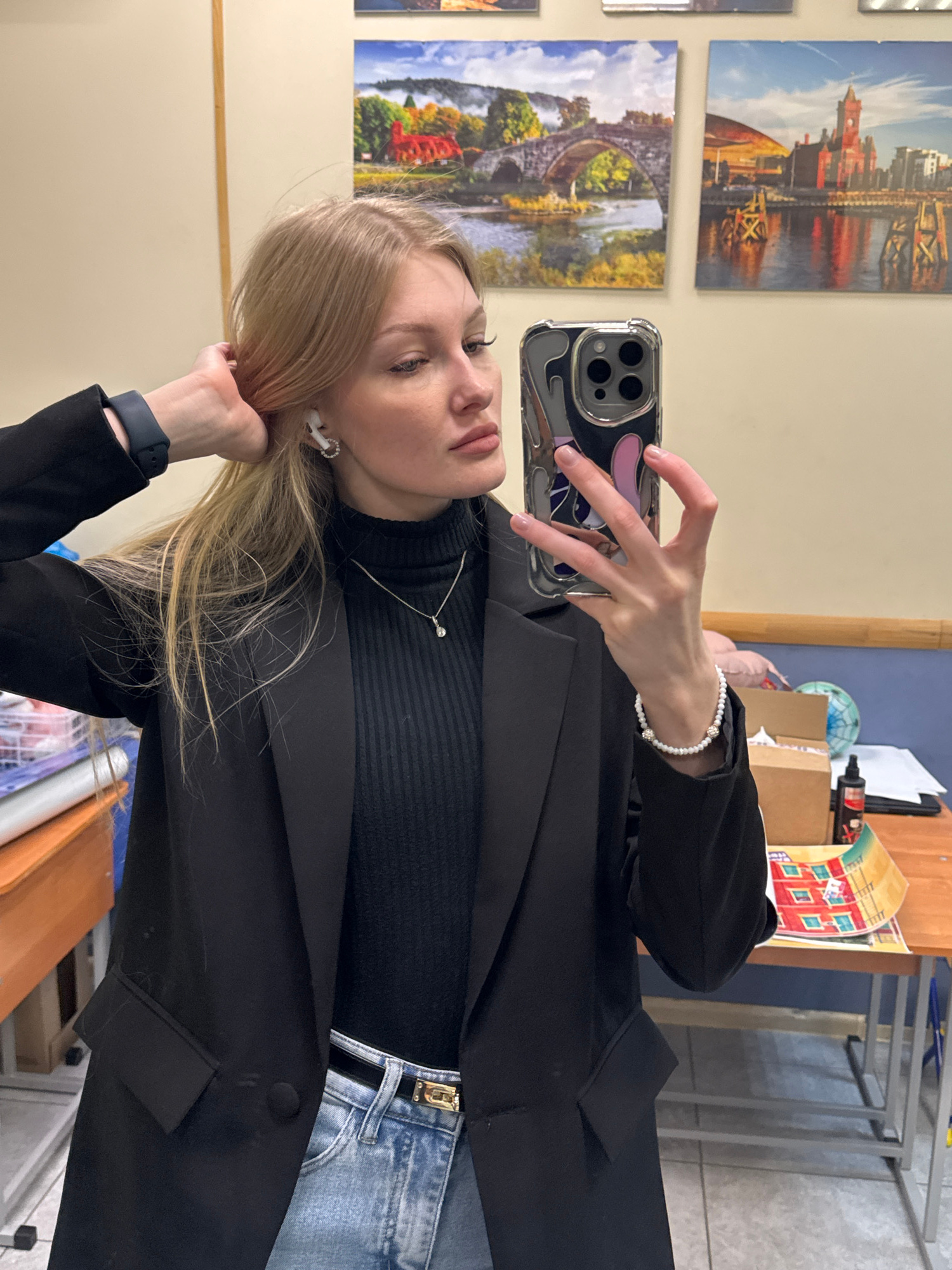 The image depicts a young woman taking a mirror selfie indoors. She has long, straight blonde hair and is shown from the chest up, looking towards the camera reflected in the mirror. She wears a blackβ¦read more