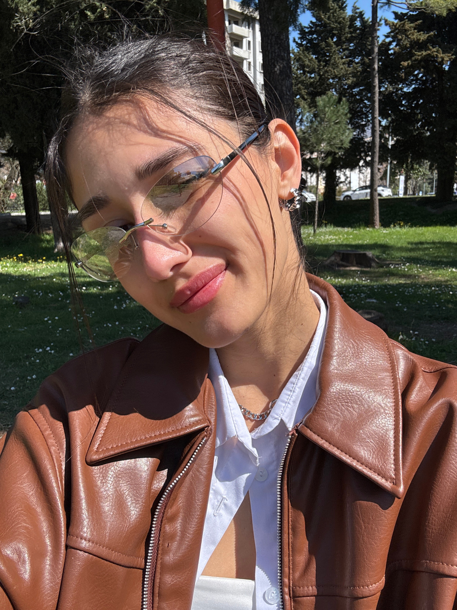 A young woman is outdoors on a sunny day in Bar, Montenegro. She is wearing glasses, a white collared shirt, a silver necklace, a brown leather jacket, and a silver earring. The background consists of…read more