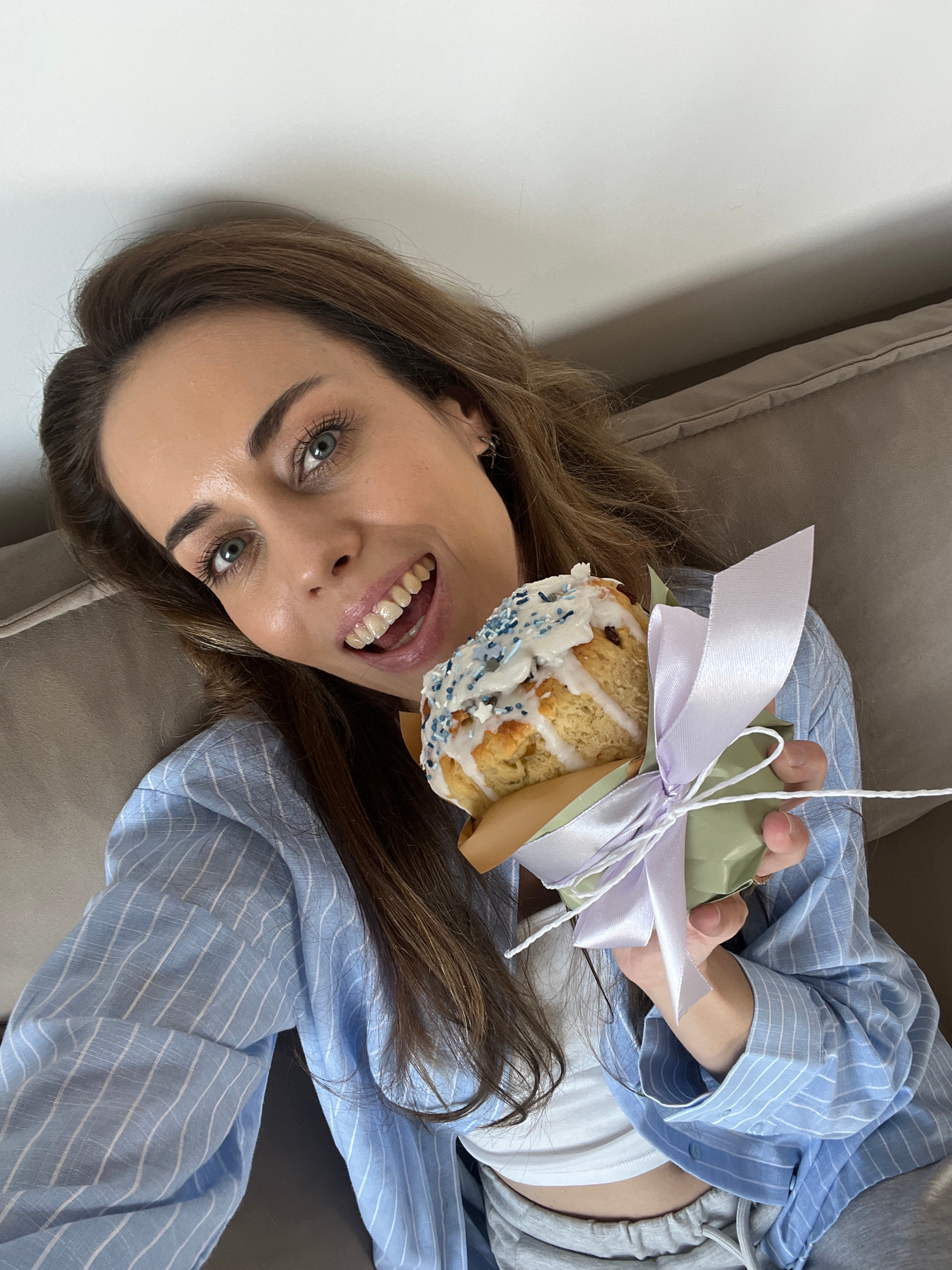 A young woman is lying on a beige couch, holding a decorated cake in her right hand. She is wearing a light blue and white striped shirt, a white tank top, and grey sweatpants. The cake is wrapped inβ¦read more