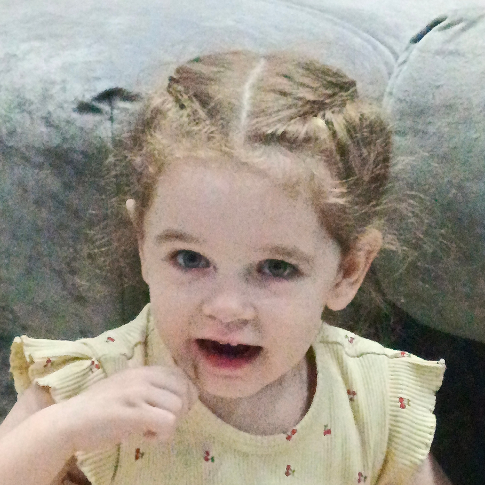 A young child, appearing to be a toddler, is the primary subject of the image. She has blonde hair styled in two buns on top of her head. The child is wearing a yellow shirt with a small cherry patter…read more