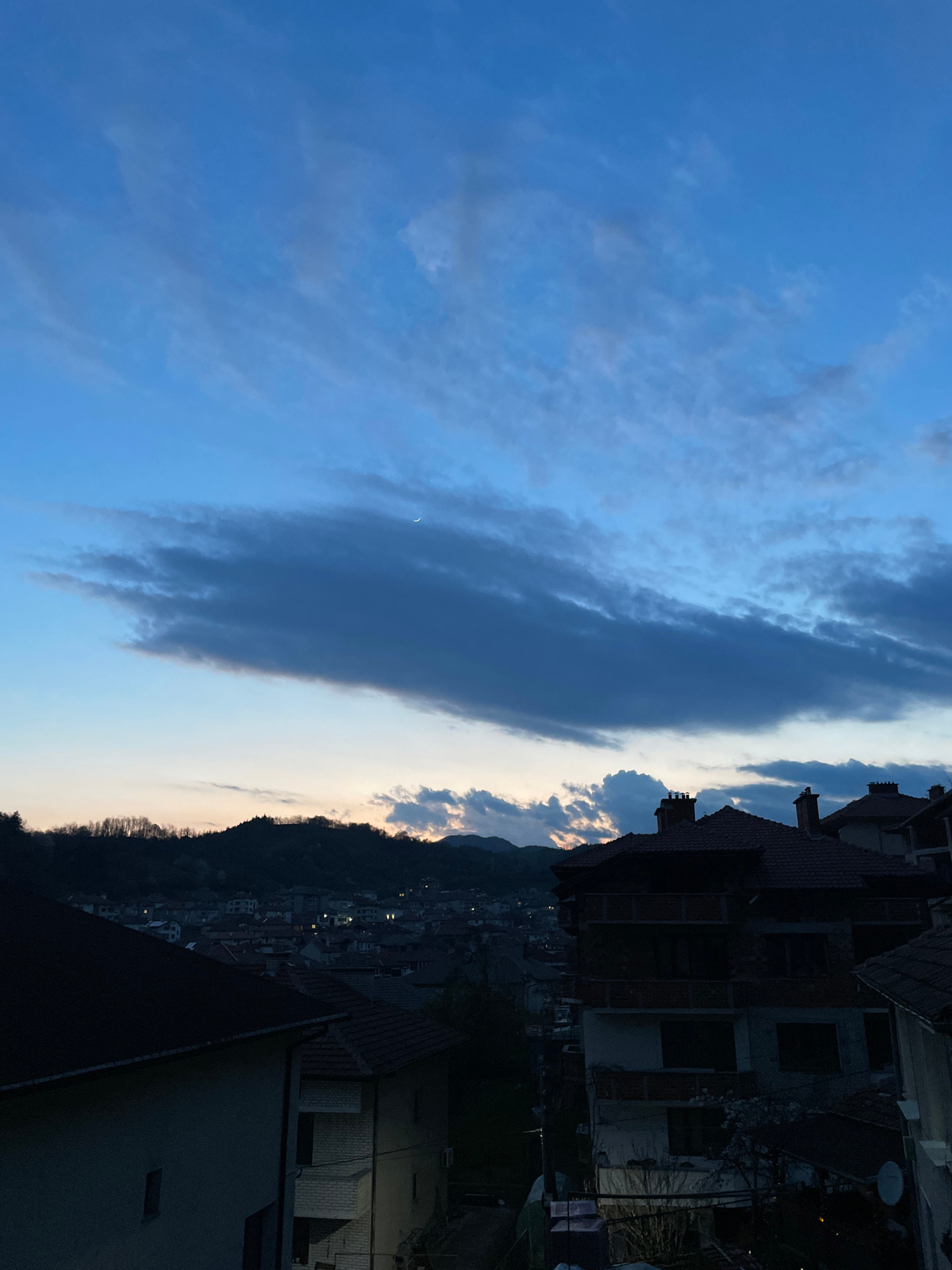 The image depicts a twilight scene in Zlatograd, Bulgaria. The sky is predominantly blue with a band of dark, elongated clouds stretching vertically across the frame, and a sliver of crescent moon visβ¦read more