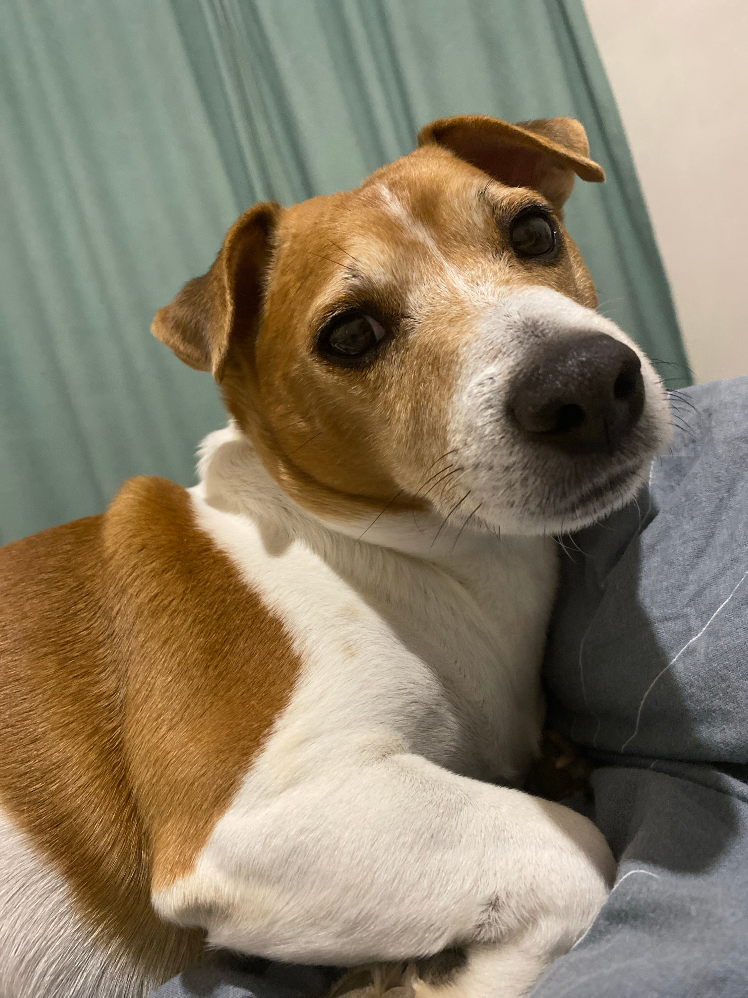 A close-up photograph shows a brown and white dog, possibly a Jack Russell Terrier mix, laying on a bed. The dog's face, with its large black nose and dark eyes, is the primary focus. The background c…read more