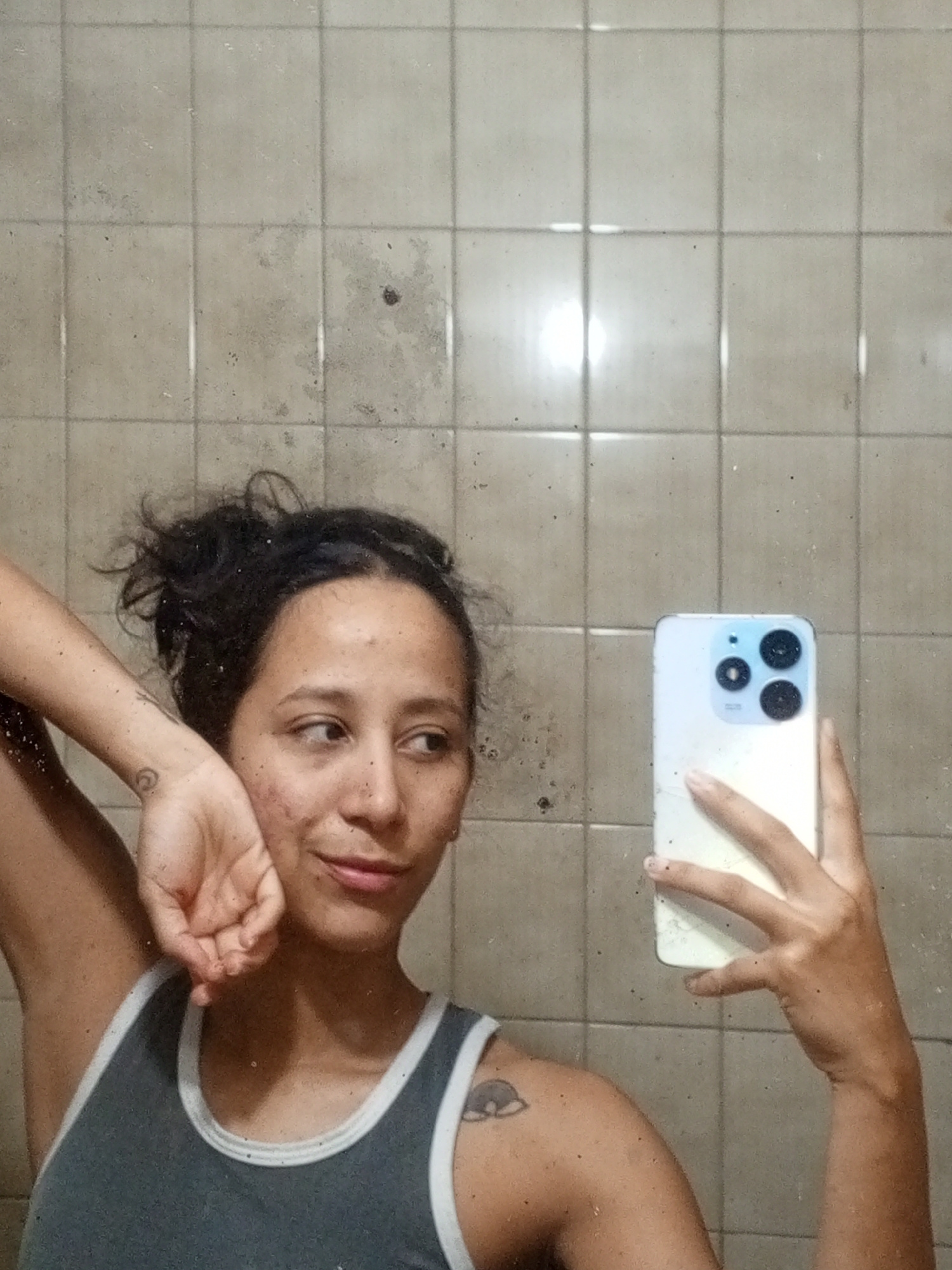 A young woman is captured in a mirror selfie, looking slightly to her right with a soft, enigmatic smile. Her dark, messy hair is pulled up, and her tan complexion shows some visible blemishes. She we…read more