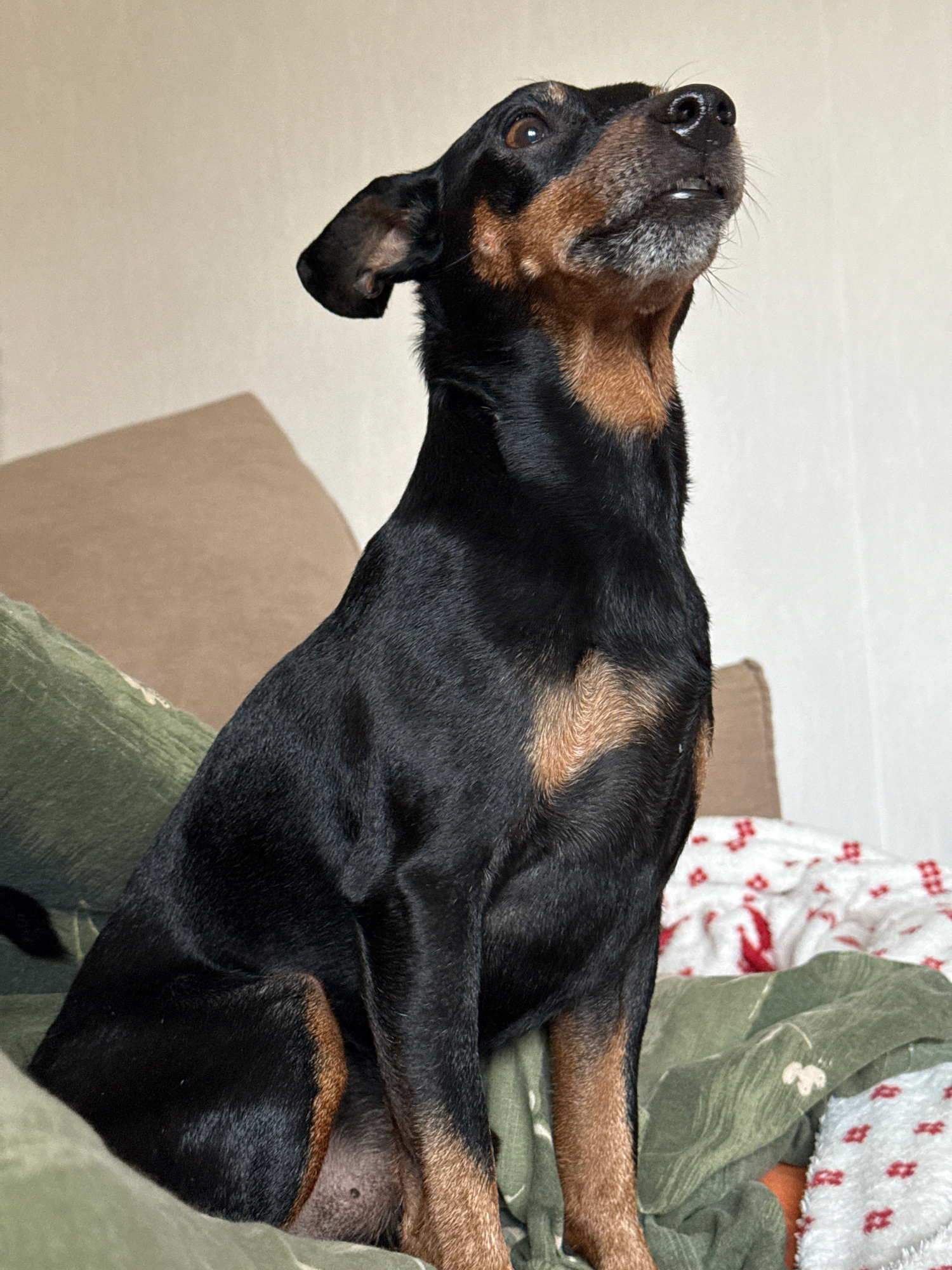 A medium shot depicts a black and brown Dachshund dog lying on a bed. The dog's head is tilted upwards, revealing its brown muzzle, eyes, and a small open mouth. The body is stretched out on the bed,…read more