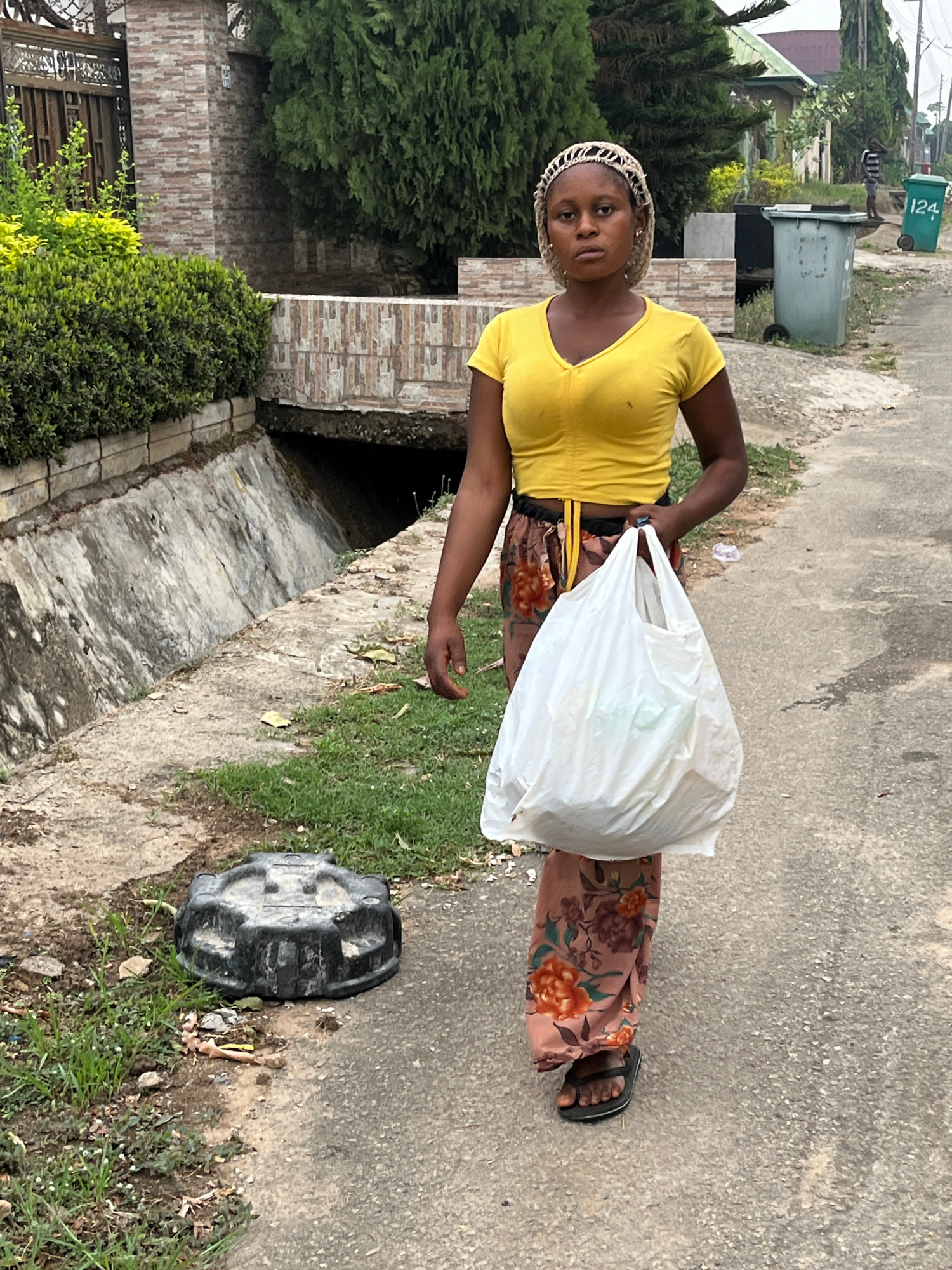 A woman wearing a yellow shirt, floral pants, and sandals stands on a paved surface next to a grassy curb. She is holding a white plastic bag. Next to the curb is a black plastic object. A drain runs along the edge of the pavement. Behind the woman are a building, bushes, and a trash can. The scene is located in Abuja, Nigeria. | Open Wire