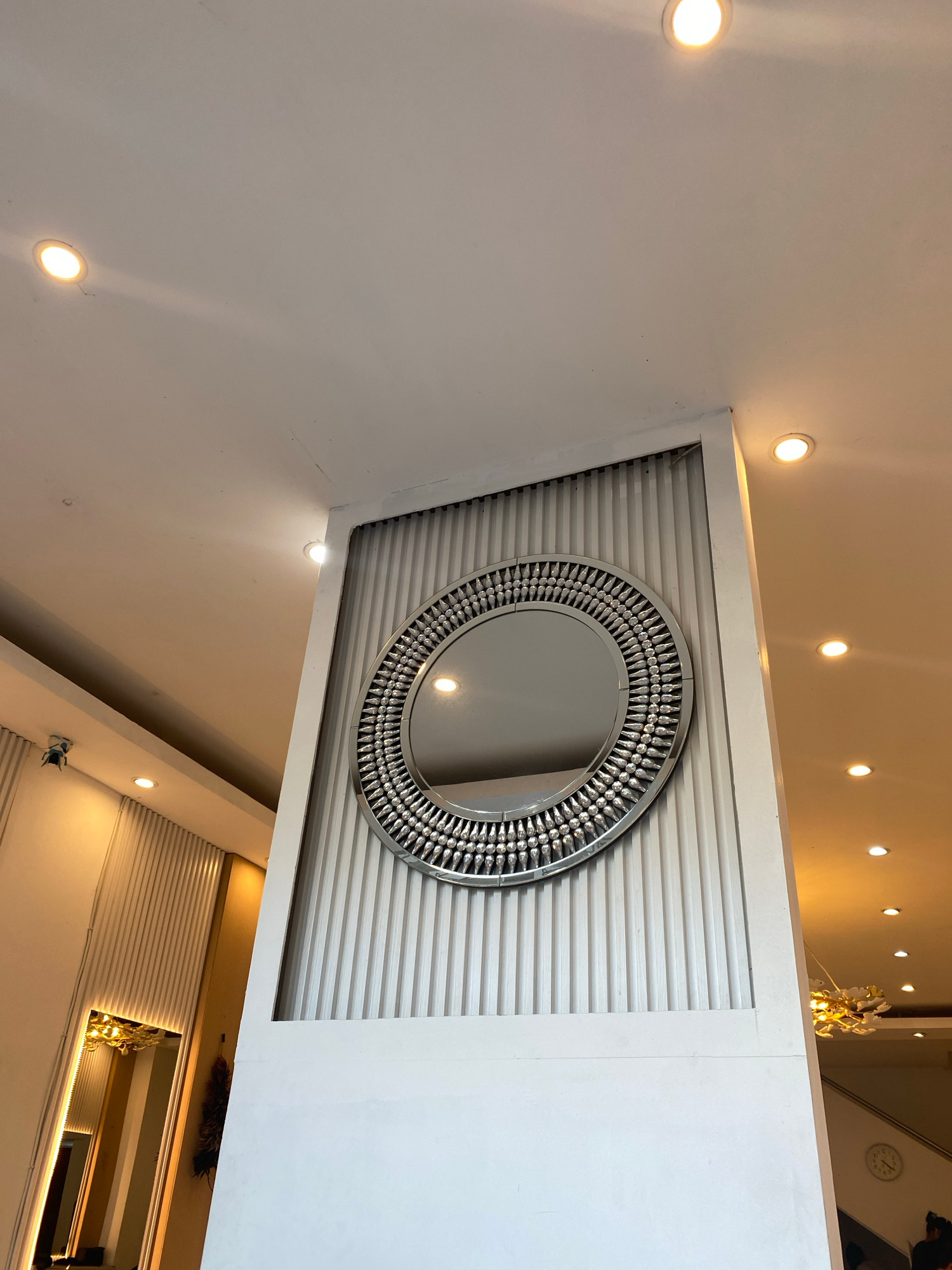 A low-angle shot shows a ceiling with recessed lighting. A decorative round mirror with a jeweled border is mounted on a paneled wall, next to a large white structure. The location is North Kuta, Indo…read more
