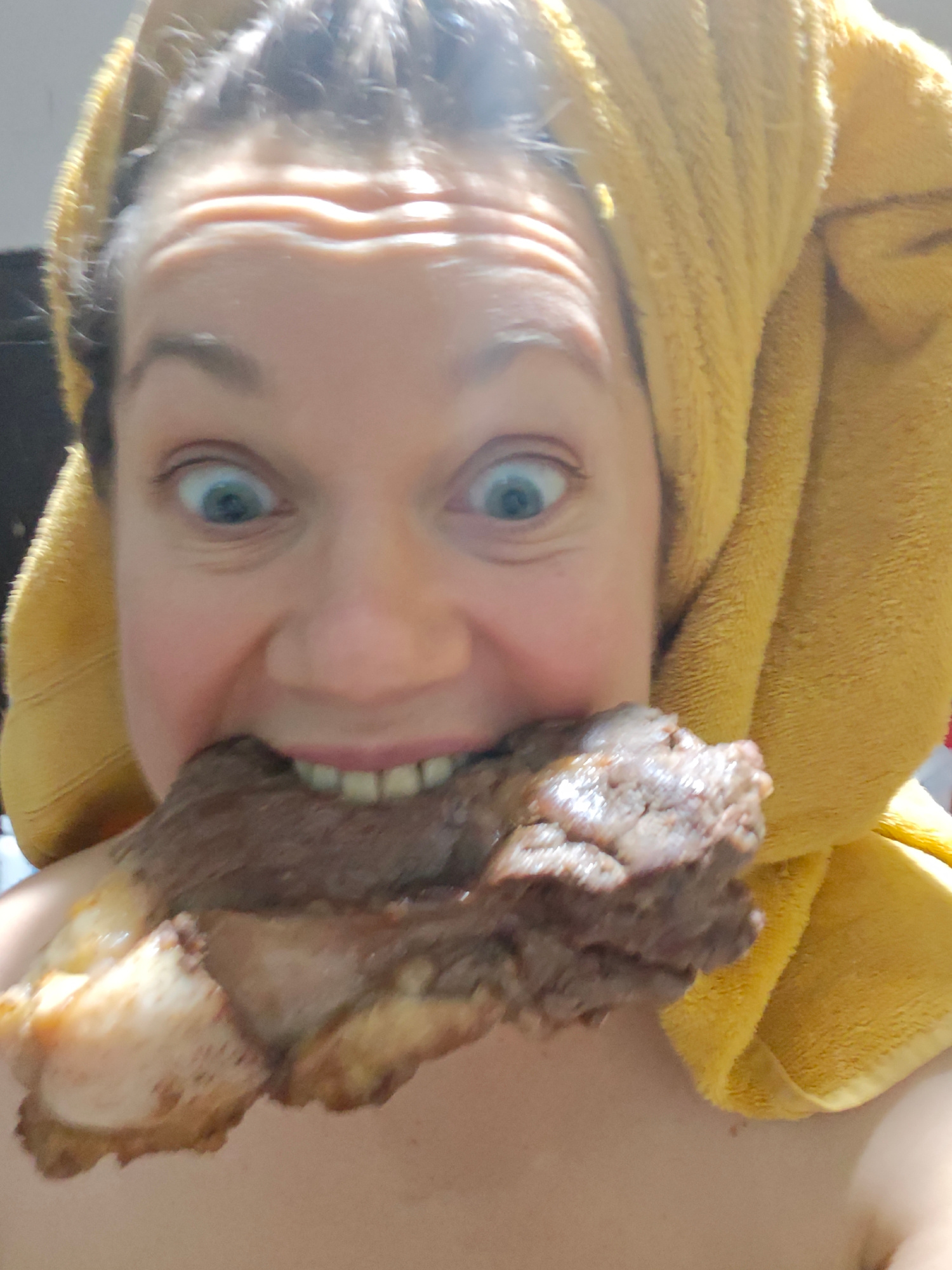 A woman with a yellow towel wrapped around her head is holding a large piece of meat in her mouth. Her eyes are wide and she is smiling. The background is out of focus. The location is not specified.