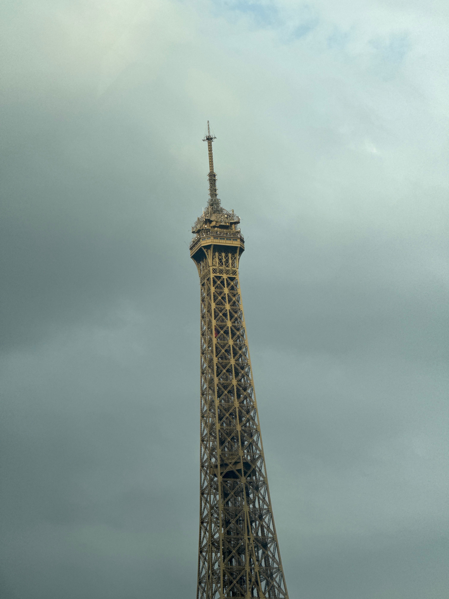 The image depicts the Eiffel Tower in Paris, France. The view is angled upwards, showing the tower against a cloudy sky. The tower's intricate metal latticework structure is visible, tapering as it ri…read more